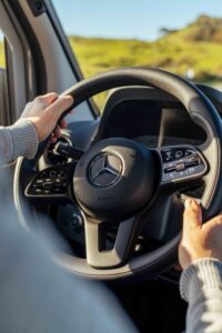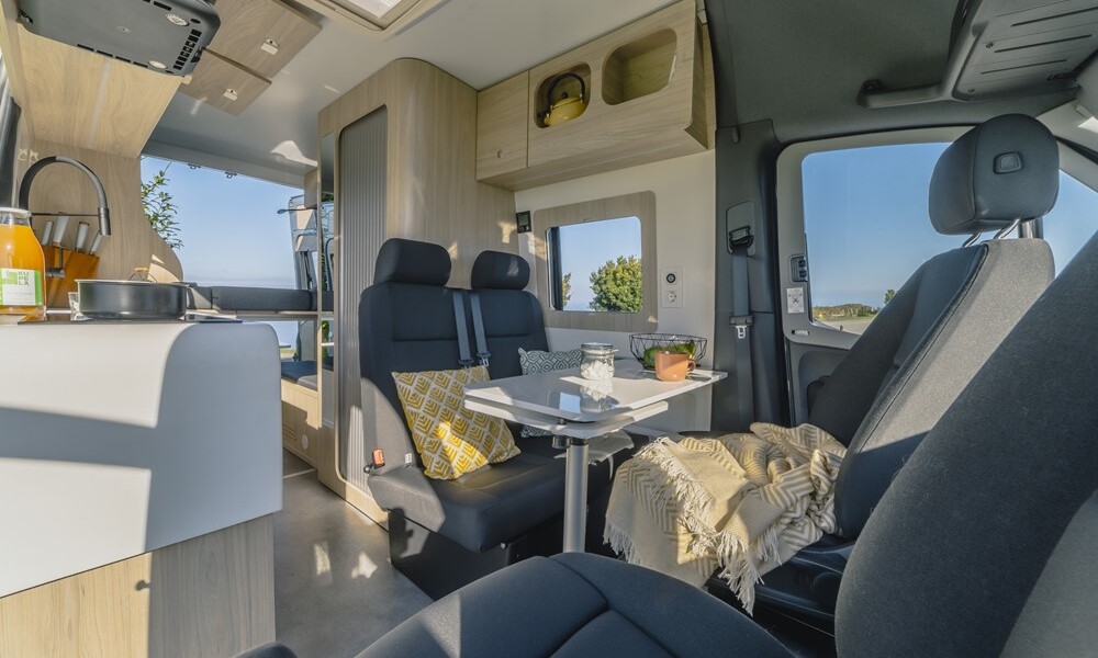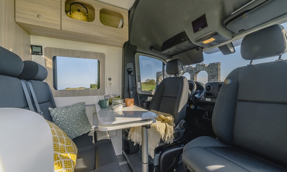 Principaux équipements : système multimédia MBUX (écran tactile 7 pouces), volant multifonctions et réglable en hauteur/inclinaison, allumage automatique des phares, régulateur de vitesse, aide au démarrage en côte, stabilisation en cas de vent latéral, 5 coloris de carrosserie, jantes acier 16 pouces, banquette avec fixations Isofix et tiroir de rangement verrouillable, stores occultant pour cabine, moustiquaire de porte latérale, douche avec régulateur de température, WC chimique (19L), hotte avec purificateur d’air, électrovannes automatiques pour la vidange des eaux grises, store manuel extérieur Thule (300 cm), batterie Bluwatt AGM 270A, convertisseur Combimaster, chargeur et stabilisateur de courant Mastervolt, pompe à eau Shurflo, prises USB et 220V, plaques vitrocéramiques à combustion Webasto Cooker, plan de travail Krion avec évier, robinet extensible, fenêtres dans salon et SDB, etc