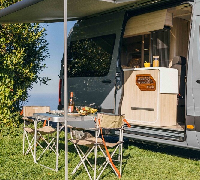 Maite Activity dispose pour l’heure d’un plan unique sur Mercedes Sprinter court (5,93m). À l’agencement classique, ce modèle intègre un lit transversal à l’arrière, un salon pour 4 personnes à l’avant et entre les deux, un bloc cuisine disposé face à un compartiment douche/toilettes. Ce fourgon se décline en deux versions : la première est prévue pour 2 voyageurs (« Maite »), quand la seconde offre un second couchage double via le toit relevable et peut donc accueillir jusqu’à 4 voyageurs (« Maite Plus »). Grâce à des joues d’élargissement, le lit dans la largeur affiche de confortables dimensions (197 x 140 cm).
