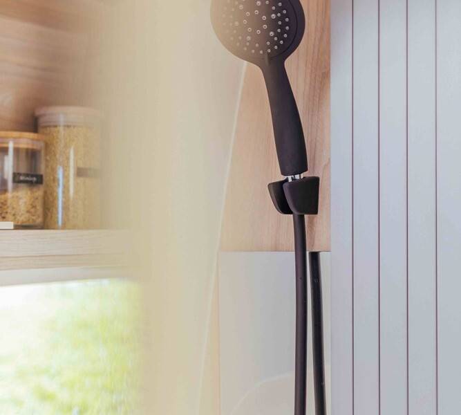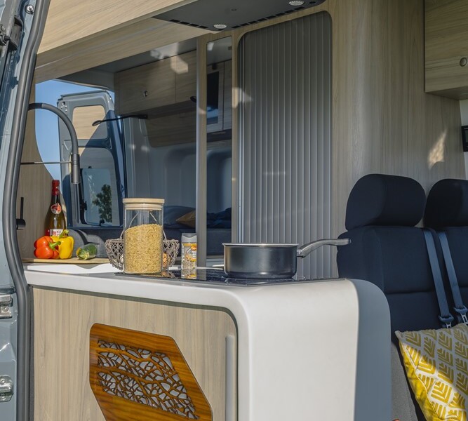 S’affranchissant du gaz, l’aménagement privilégie des plaques de cuisson vitrocéramiques Webasto ainsi qu’un chauffage Truma 6D ; deux équipements alimentés par le carburant du véhicule.