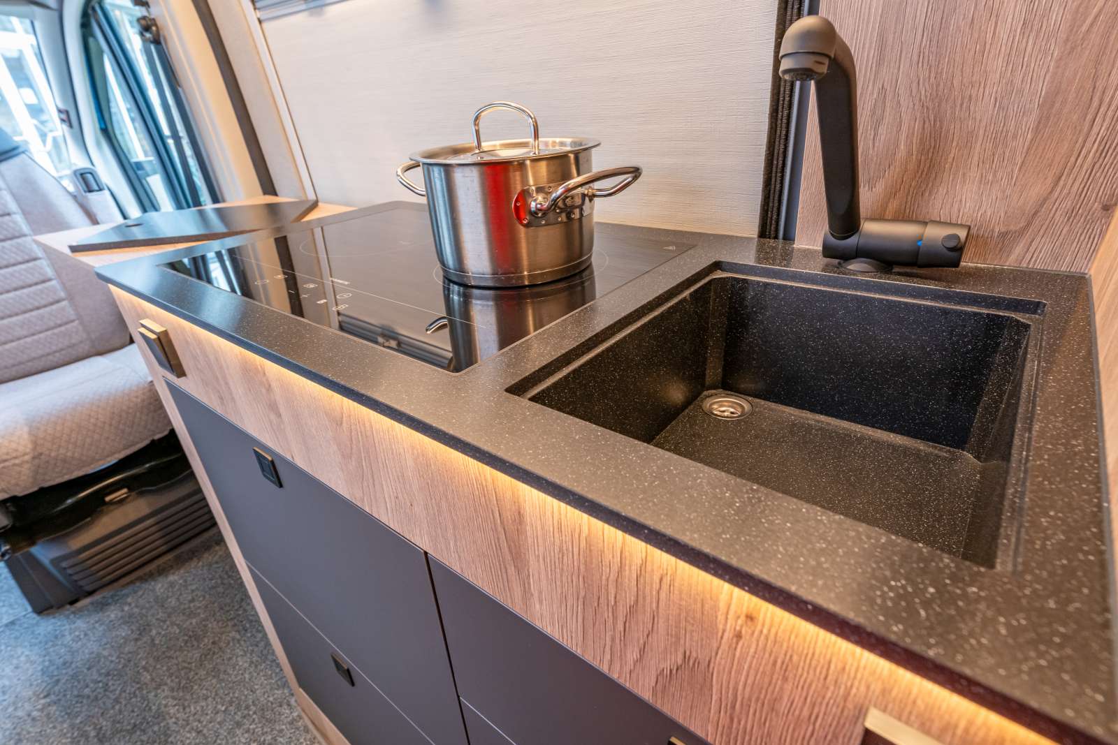 Le cœur de l’Edition 40 repose sur une plaque de cuisson à induction, parfaitement intégrée au plan de travail en résine minérale avec évier encastré. Les deux zones de cuisson développent une puissance de 1 000 et 1 300 W. Afin de permettre leur utilisation simultanée sans raccordement à une source électrique externe, La Strada équipe le véhicule d’un onduleur de 3 600 W installé dans le coffre arrière et alimenté par une batterie lithium de 410 Ah. Un chargeur de 120 Ah garanti une recharge rapide et efficace après utilisation.