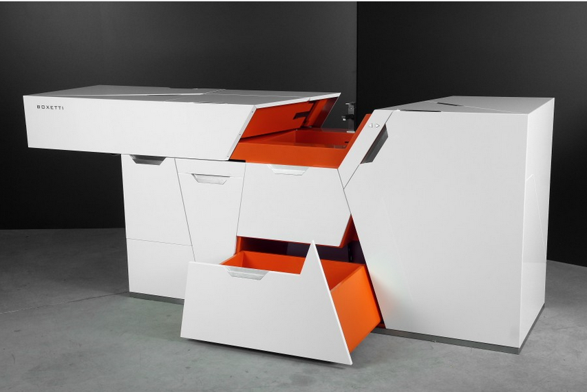 Œuvre du designer letton Rolands Landsbergs, la collection Boxetti propose des meubles modulables aux lignes anguleuses et aux coloris contrastés (blanc/orange). Moderne, la Boxetti Lunch imbrique différents modules à la manière de briques Tetris. La cuisine se veut également intelligente : une partie du comptoir coulisse électriquement pour libérer l’évier et robinet encastrés. Une solution qui nécessite un peu d’espace, mais reste possible dans un fourgon (comme en atteste la cuisine extensible Pilote, basée sur le même principe). Dans le détail, le bloc comprend de base un espace pour un petit réfrigérateur, un évier, une poubelle, de multiples rangements ainsi que deux sièges de bar escamotables. Une planche à découper et un logement pour couteaux sont prévus dans le plan de travail, sous un couvercle relevable lui-même équipé de spots à LED. Selon le site Internet, le tarif de la Boxetti Lunch démarre à partir de … 9200€.