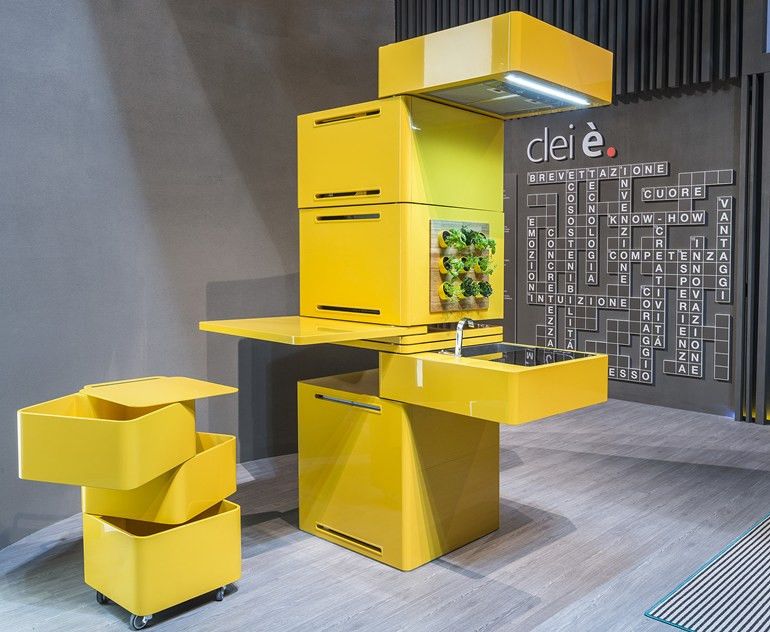 Sorti tout droit de l’imaginaire de l’architecte italien Massimo Facchinetti, cette cuisine en forme de colonne a été présentée en 2013 au salon du design de Milan. Sa force est de proposer dans un encombrement réduit toutes les commodités d’une cuisine domestique : réfrigérateur, lave-vaisselle, micro-ondes, plaques à induction, évier, machine à café, hotte éclairé, etc. On aime aussi le mur d’herbes aromatiques, véritable touche de verdure qui égaie cette colonne de métal.