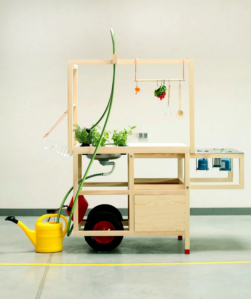 Côté équipements, cette cuisine mobile se distingue par sa simplicité : évier relié à une pompe à pied, arrosoir en guise de réservoir, robinet en tube d’arrosage… On aime le plan de cuisson avec réchaud au gaz coulissant ainsi que le cadre permettant de suspendre toutes sortes d’ustensiles et pots d’herbes aromatiques. En revanche, le frigo n’est pas inclus ici. Naturelle et minimaliste, la « Mobile hospitality » est fabriquée à partir de bois massif.