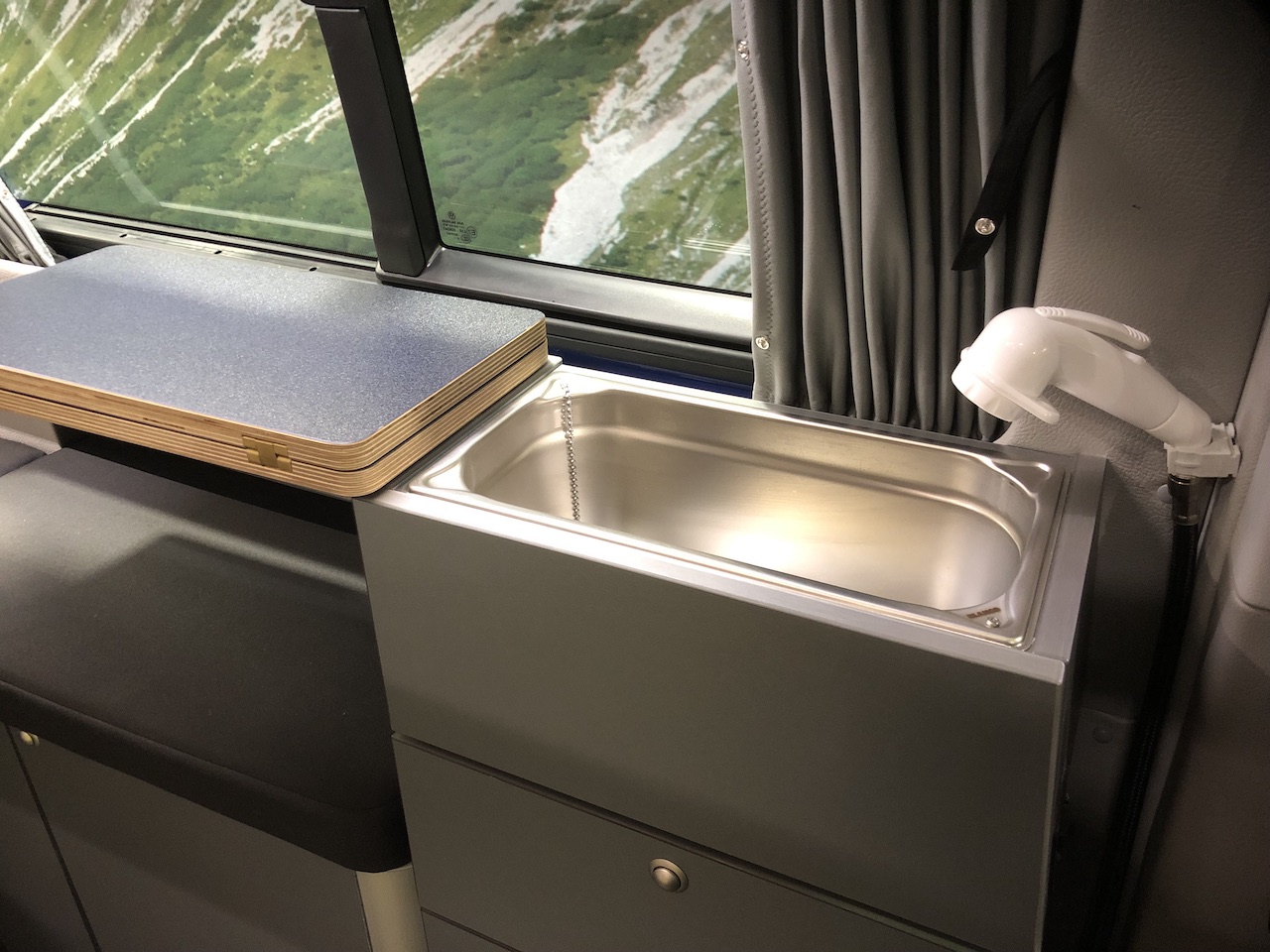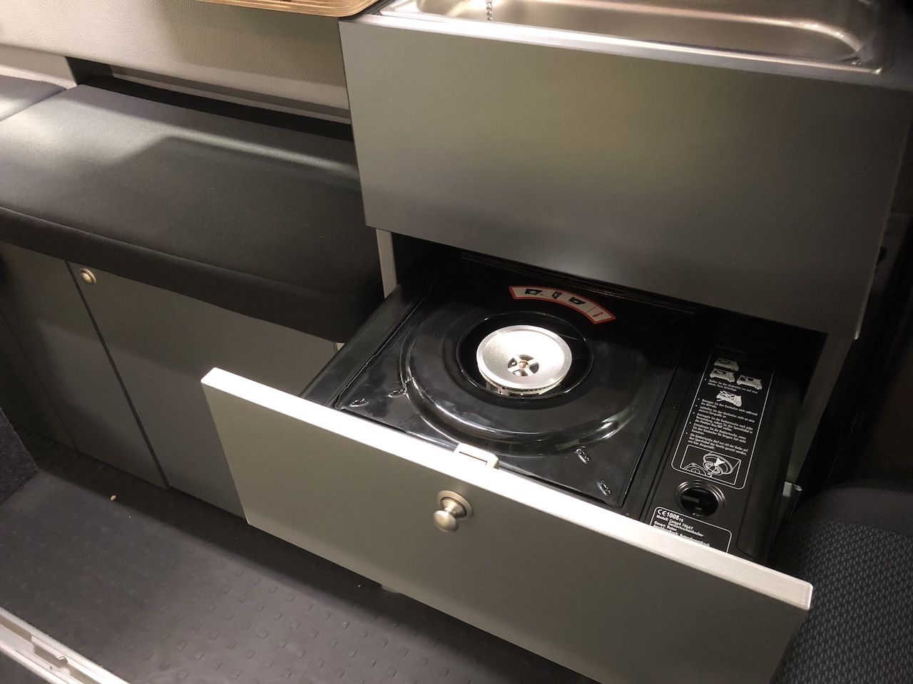 Le Vanster est équipé de série d’une plaque de cuisson à induction posée sur une tablette escamotable, dans le montant arrière du coffre. Son utilisation impose évidemment un branchement électrique extérieur et donc un arrêt au camping. En supplémentt, Pössl prévoit l’installation d’un meuble de cuisine portable (CampBox) comprenant à minima un réchaud deux feux et un évier pour des séjours plus long et en pleine autonomie.