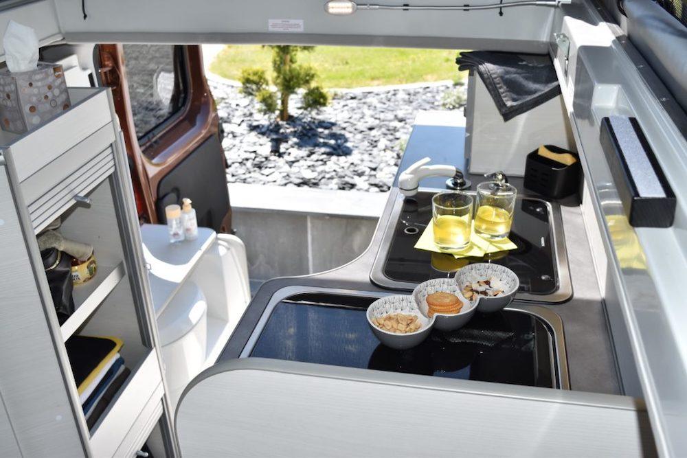 Les atouts invoqués ? « Le hayon permet tout d’abord de s’abriter de la pluie quand on doit accéder au coffre et charger du matériel. Aussi, lorsqu’il est relevé, on peut venir ventouser la douchette dessus. Ce qui est pratique pour se laver à l’extérieur. On pourra aussi gagner en intimité en ayant recours à un auvent, argue Maxime Labeyrie qui ajoute. A l’intérieur, avantage aussi au hayon pour sa grande baie vitrée, qui offre une meilleure vue et luminosité que les deux fenêtres que l’on trouve sur les portes battantes ».