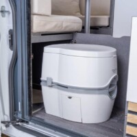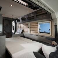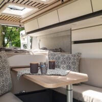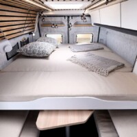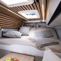Un WC portable est par ailleurs logé dans un coffre à gauche de l’entrée. Autre idée futée pour économiser de la place à bord : le plateau de table se glisse, quand on ne l’utilise pas, dans un interstice sur le flanc du lit. En option, enfin, il est possible d’ajouter une extension de couchage. Celle-ci prend la forme d’un sommier peigne, qui vient se déployer au-dessus des banquettes en prenant appui sur la table. On dispose alors d’un lit gigantesque de 210 x 200 cm !
