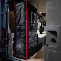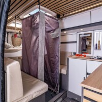 Dans le détail, le canapé longitudinal peut se transformer en lit grâce à son sommier peigne. En mode route, on pourra le rabattre contre la paroi pour laisser place à un ou deux sièges (optionnels) montés sur rails. Sur la paroi opposée, attenant à la porte coulissante, on trouve le bloc cuisine scindé en deux. Avec d’un côté, une partie évier/réserves d’eau extractible (dont on ne connait pas le poids…) et de l’autre, la partie fixe intégrant le réchaud et des rangements. Le tout est prolongé par un meuble en colonne, incorporant un frigo à ouverture bilatérale. Tenant dans un sac, la douche est formée d’un bac qui s’arrime au plancher, avec une bonde à positionner face à une coupelle d’évacuation, et d’un rideau souple qui s’accroche au plafond à l’aide de sangles. A la même place, il est possible d’installer une colonne de rangement souple. Au final, si ce CROSSCAMP Flex 541 pousse très (peut-être trop ?) loin les possibilités de modulation, il préfigure sans doute ce que pourrait être le fourgon de demain. A savoir un véhicule capable de s’adapter à des usages multiples.
