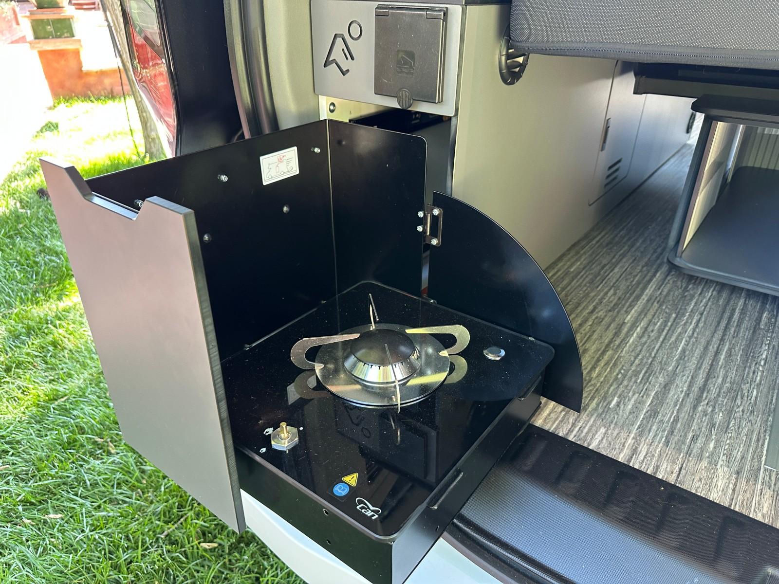 Minimaliste, la dotation camping prévoit de série un réchaud 1 feu intégré dans un tiroir à l’arrière (accessible une fois le hayon ouvert), une douchette extérieure reliée à une réserve d’eau extractible de 10 L , des prises (12 V, 230 V et USB/USB-C) et une table utilisable à l’intérieur comme à l’extérieur. Notez que les parois et le hayon sont bien isolés avec un mélange de laine de roche et polyéthylène multicouches. Au gré des options et des packs, le P09 peut être enrichi de quelques équipements additionnels : glacière à compression 24 L, chauffage, WC portable, stores occultants de cabine, tente de hayon, etc.