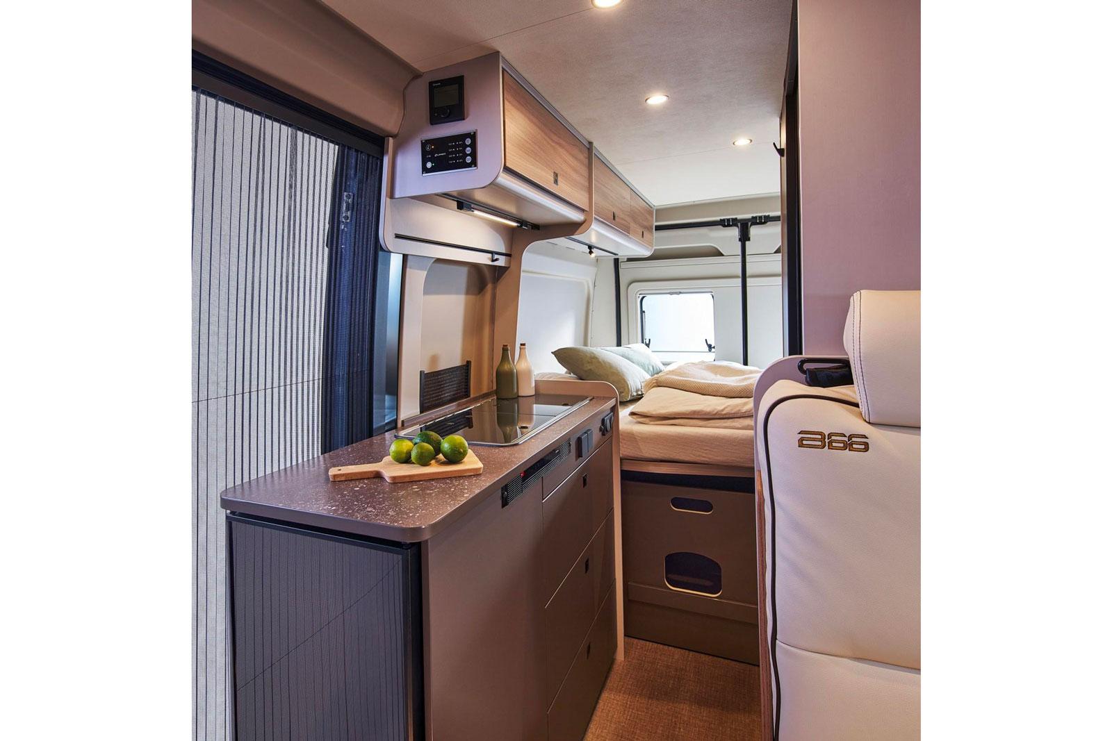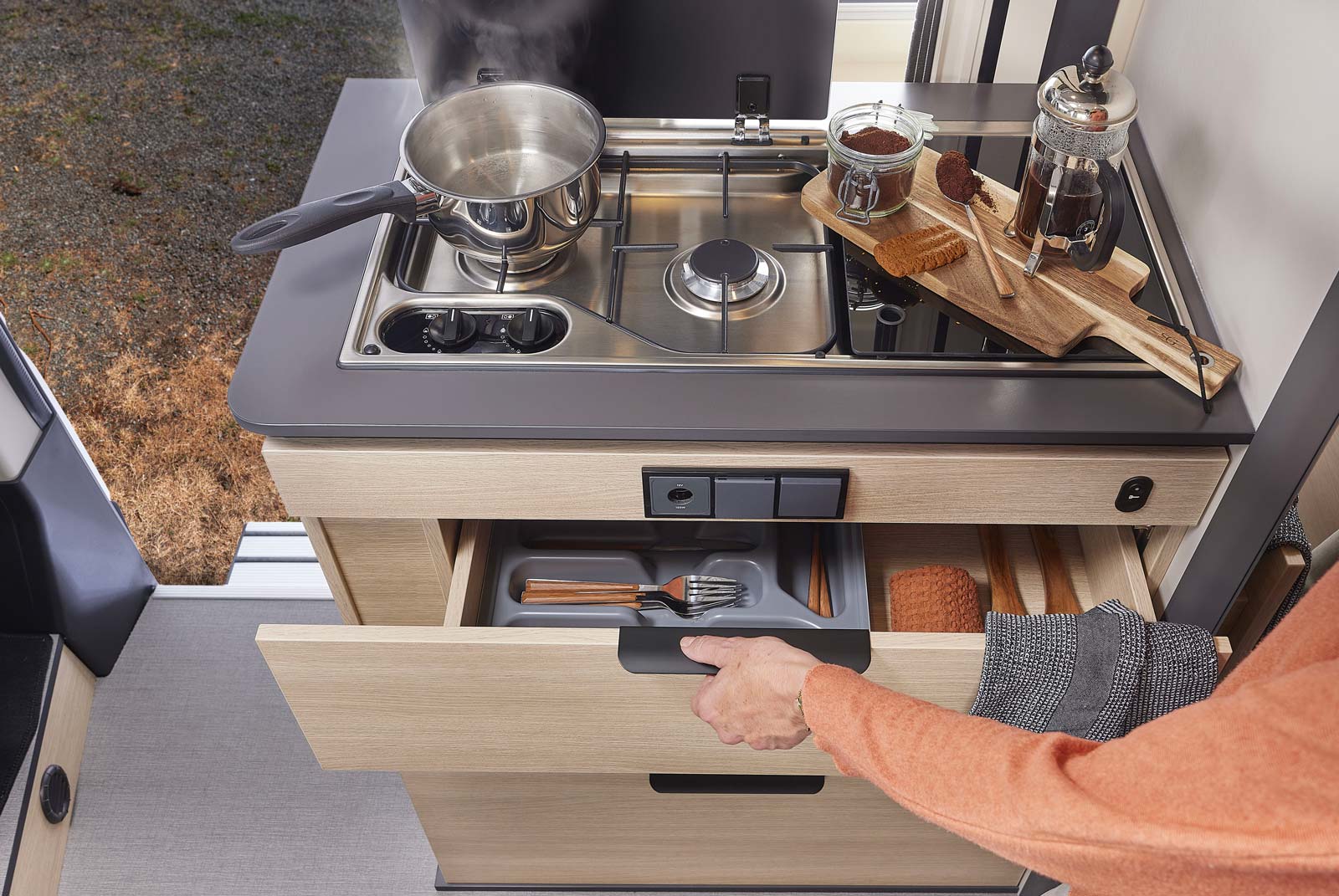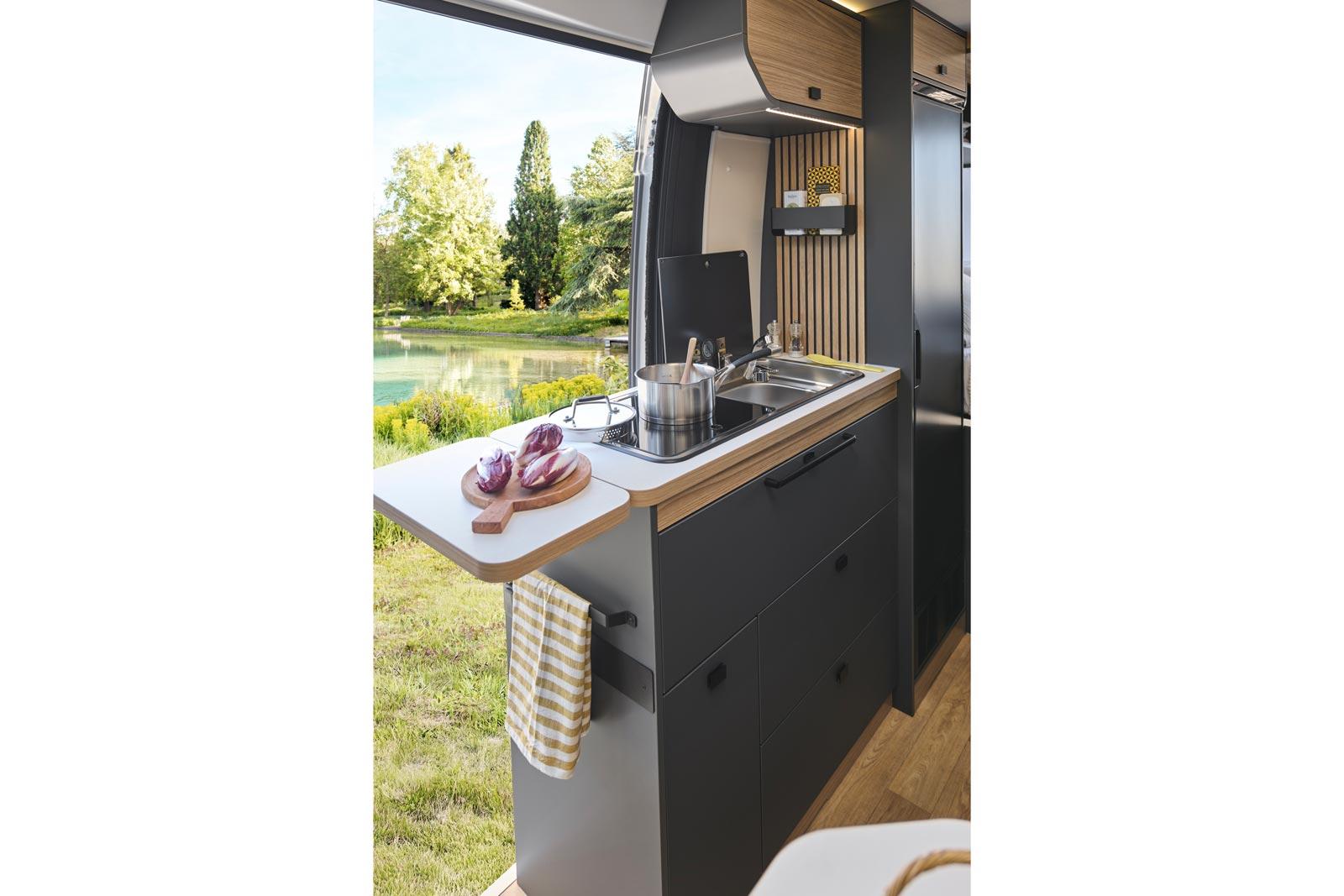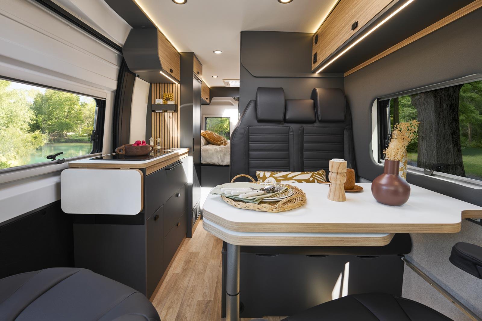 • pack Confort : moustiquaire pour la porte latérale, prédisposition pour la caméra de recul, réservoir eaux usées isolé et chauffé, éclairage extérieur LED et système de gouttière pour la porte coulissante, caillebotis de douche en bois, habillage des parois de la chambre à coucher arrière en simili cuir, tablette rabattable dans la cuisine