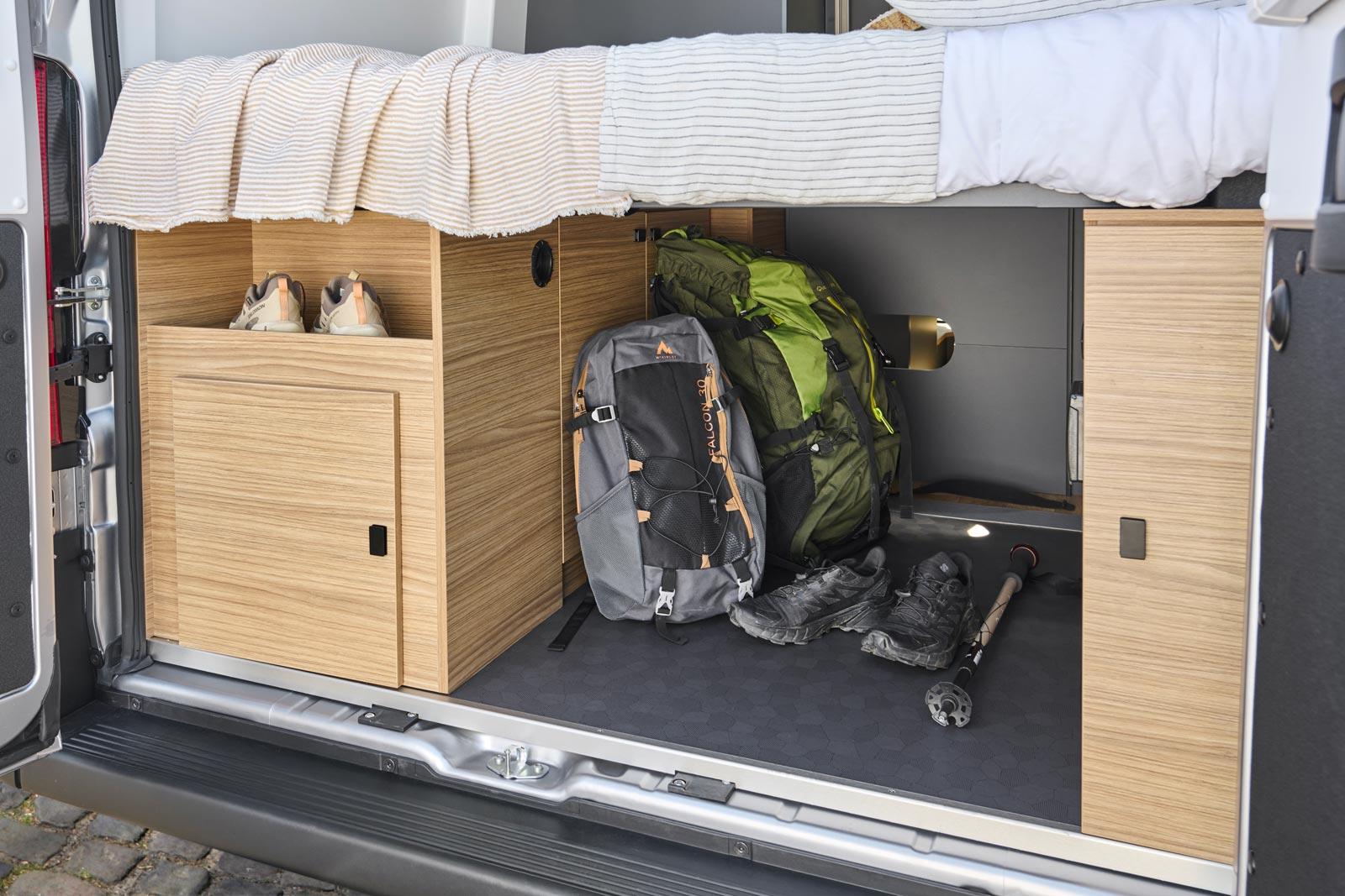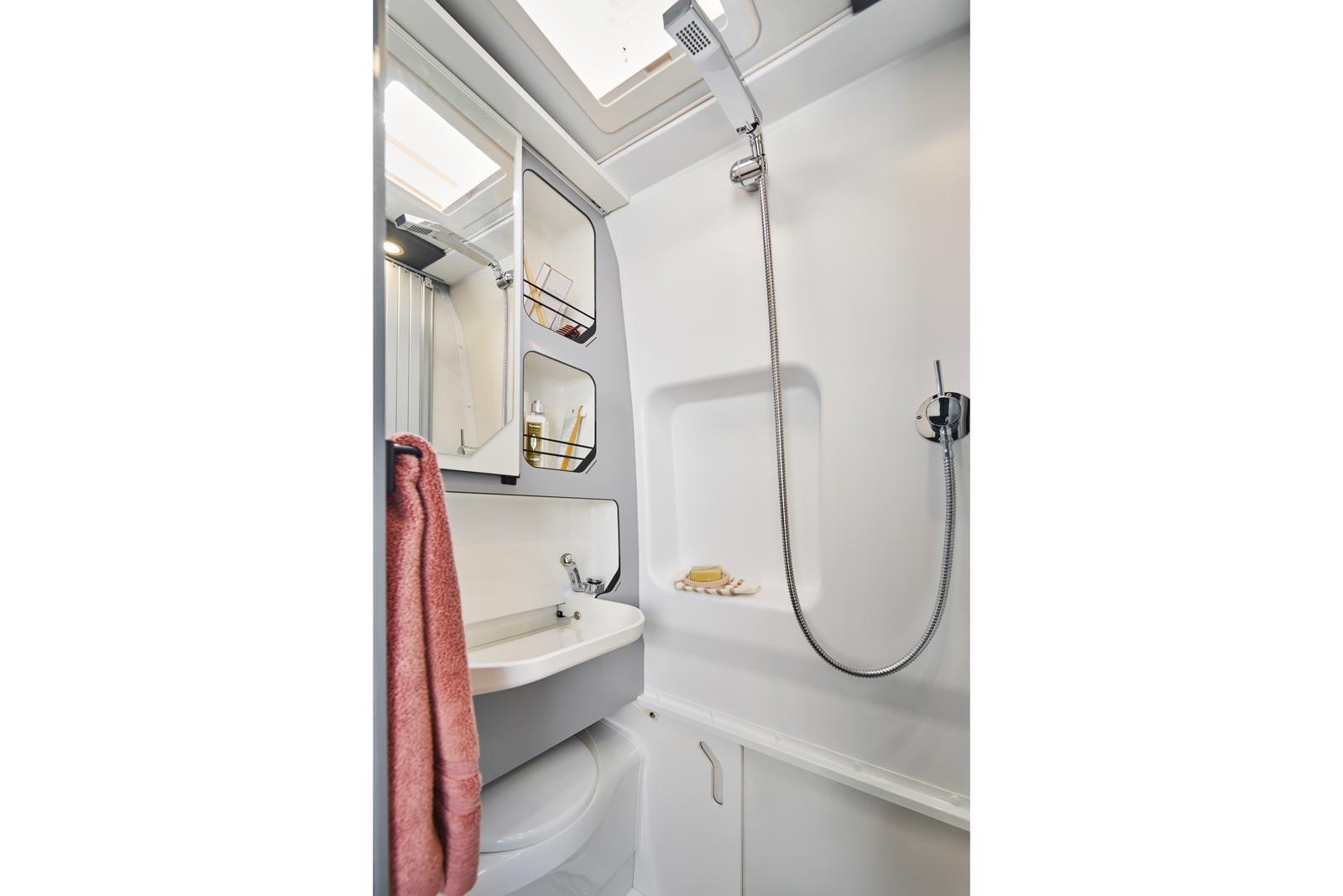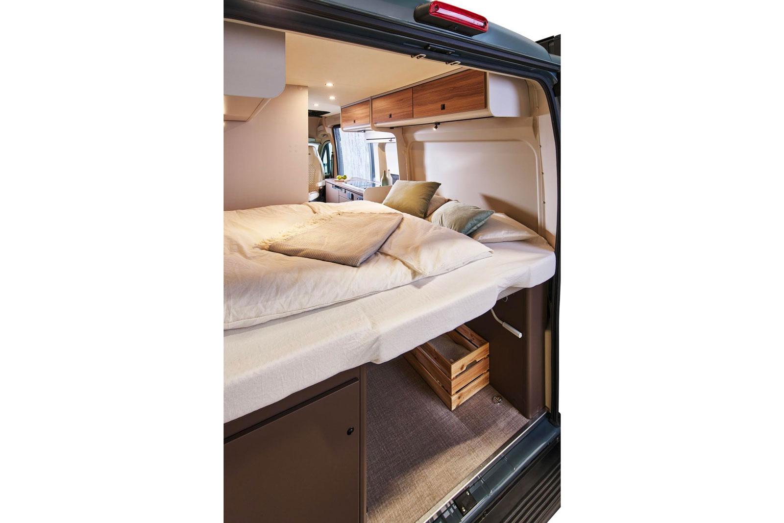 • pack Confort : moustiquaire pour la porte latérale, prédisposition pour la caméra de recul, réservoir eaux usées isolé et chauffé, éclairage extérieur LED et système de gouttière pour la porte coulissante, caillebotis de douche en bois, habillage des parois de la chambre à coucher arrière en simili cuir, tablette rabattable dans la cuisine