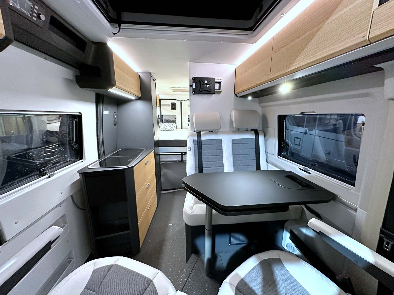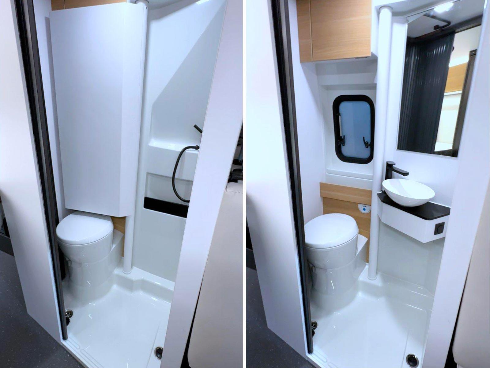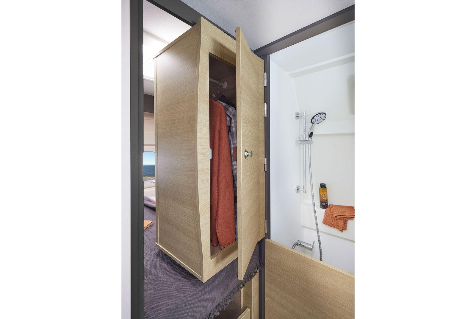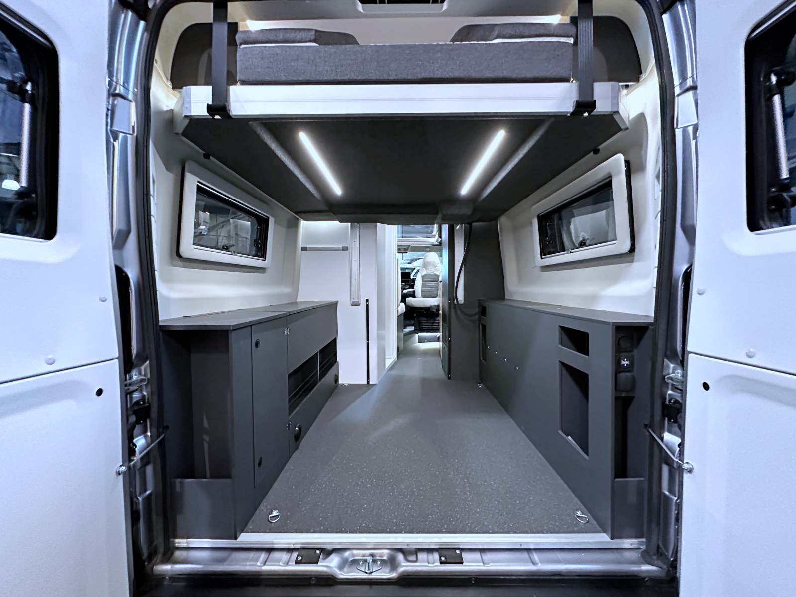 • pack Confort : moustiquaire pour la porte latérale, prédisposition pour la caméra de recul, réservoir eaux usées isolé et chauffé, éclairage extérieur LED et système de gouttière pour la porte coulissante, caillebotis de douche en bois, habillage des parois de la chambre à coucher arrière en simili cuir, tablette rabattable dans la cuisine