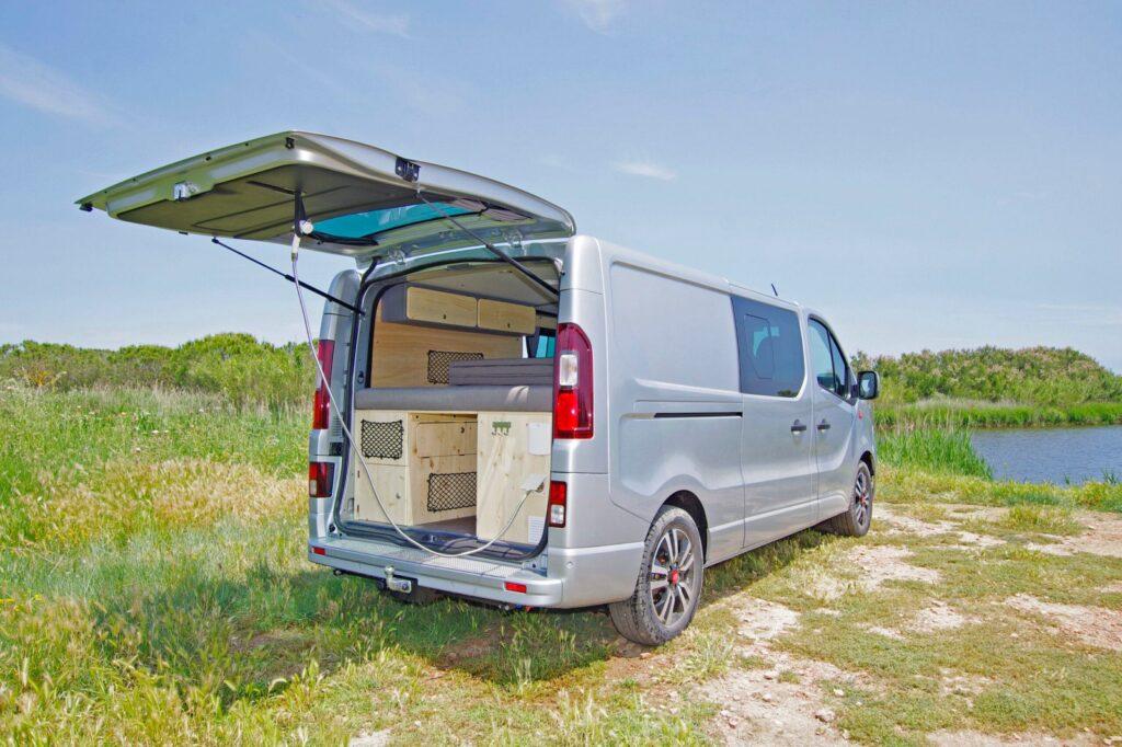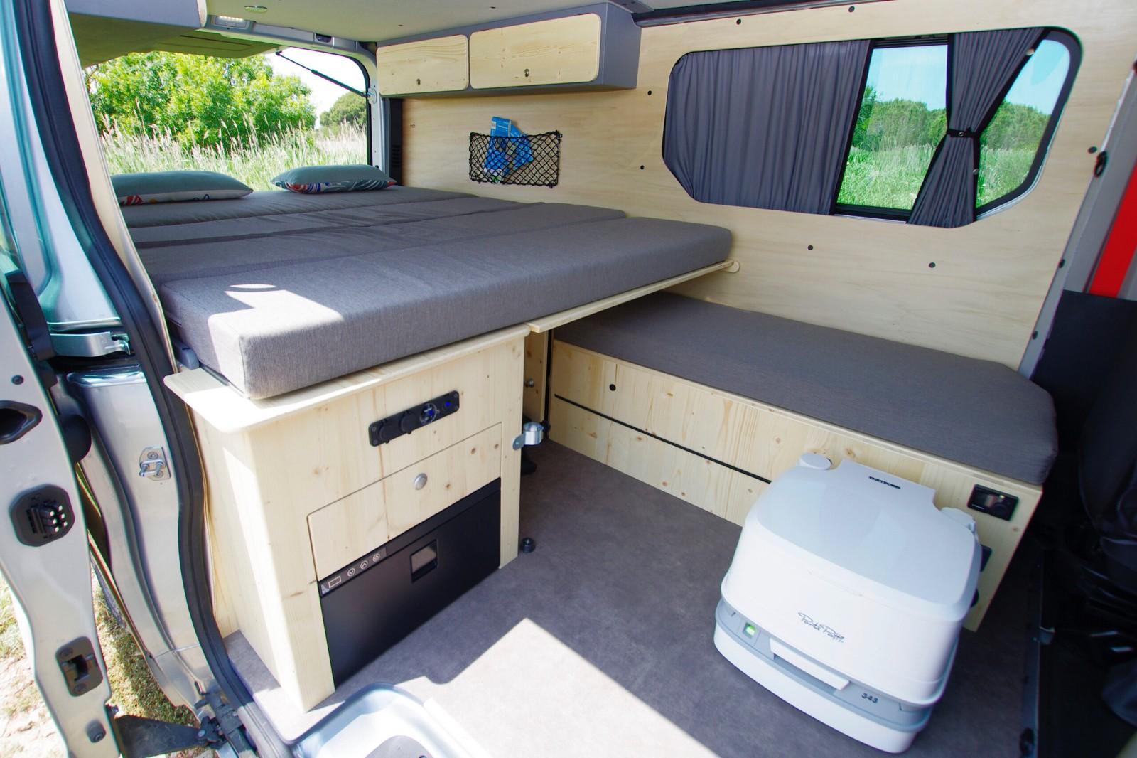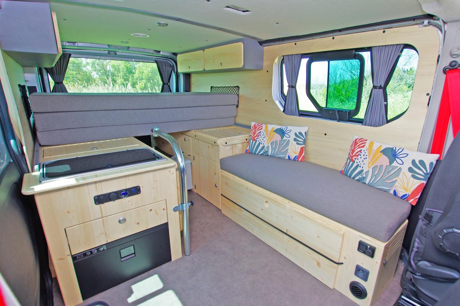 Disponible sur différents porteurs L2H1 (VW Transporter / Renault Trafic & Nissan NV 300/ Ford Custom), cet aménagement a été conçu pour voyager à deux, voire à trois si l’utilitaire d’origine est équipé d’une banquette deux places passagers en cabine. En résulte, l’absence de banquette ou de sièges homologués pour la route en partie arrière. A la place de quoi, on trouve une simple banquette latérale, utilisable à l’étape. Le toit relevable, quant à lui, fait partie de la longue liste d’équipements optionnels. Et le modèle proposé est de type « champignon », c’est-à-dire qu’il permet uniquement la station debout dans la zone de vie, sans offrir de lit supplémentaire sous toit.