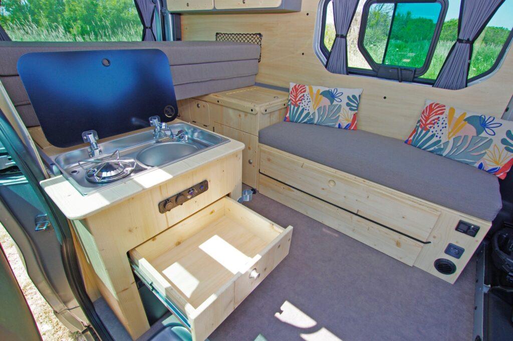 Disponible à partir de 12.000 €, l’aménagement seul offre un excellent rapport prestations/prix. Sont ici inclus de série l’isolation du van, l’électricité, le mobilier en épicéa, l’homologation VASP et un bon niveau d’équipements (voir détail plus bas).