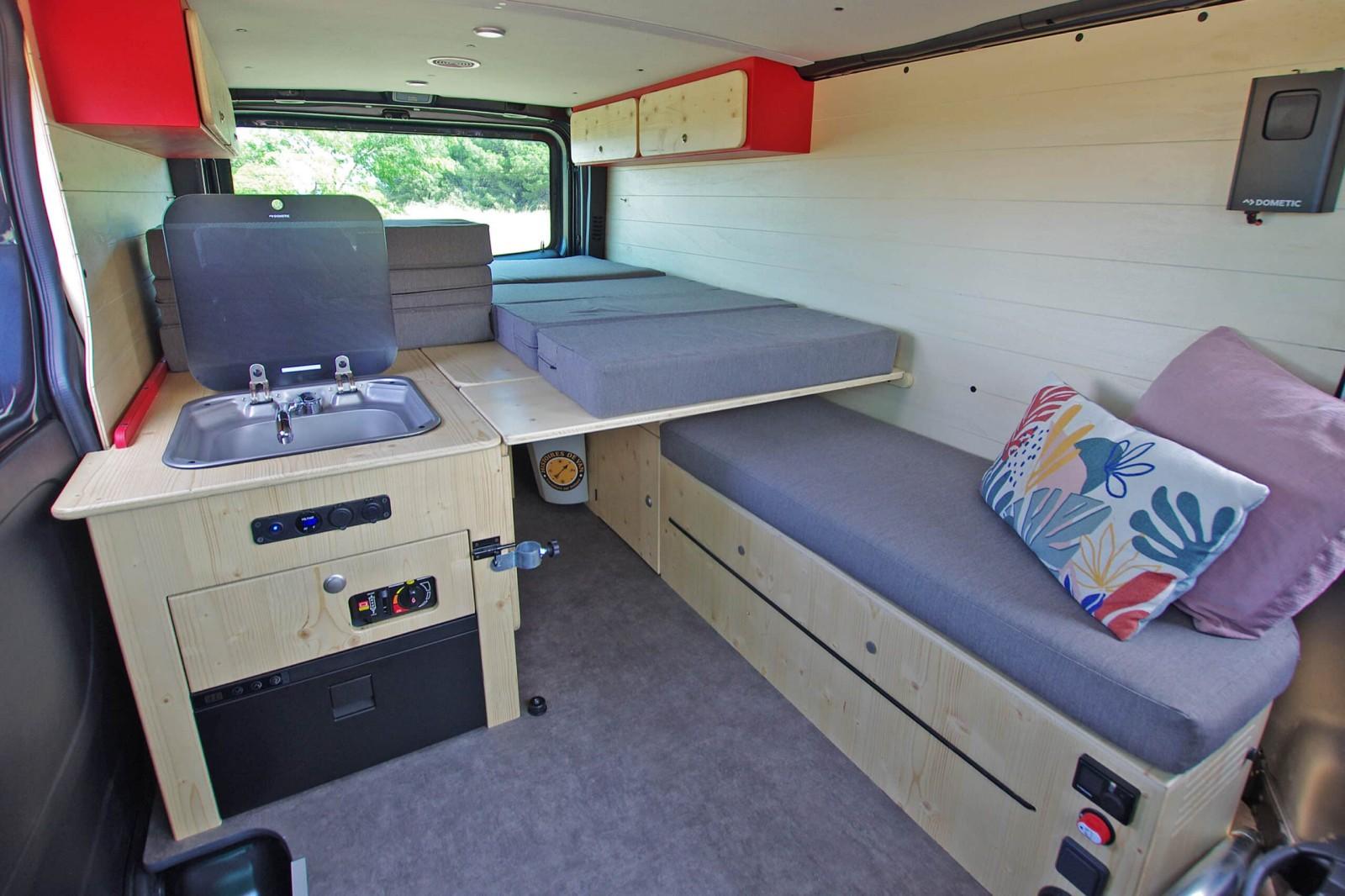 Disponible sur différents porteurs L2H1 (VW Transporter / Renault Trafic & Nissan NV 300/ Ford Custom), cet aménagement a été conçu pour voyager à deux, voire à trois si l’utilitaire d’origine est équipé d’une banquette deux places passagers en cabine. En résulte, l’absence de banquette ou de sièges homologués pour la route en partie arrière. A la place de quoi, on trouve une simple banquette latérale, utilisable à l’étape. Le toit relevable, quant à lui, fait partie de la longue liste d’équipements optionnels. Et le modèle proposé est de type « champignon », c’est-à-dire qu’il permet uniquement la station debout dans la zone de vie, sans offrir de lit supplémentaire sous toit.