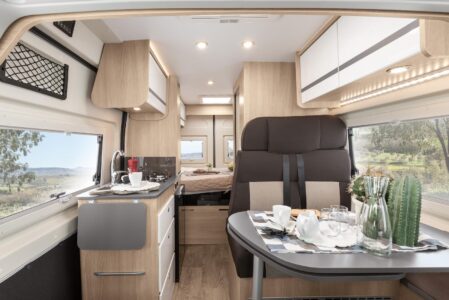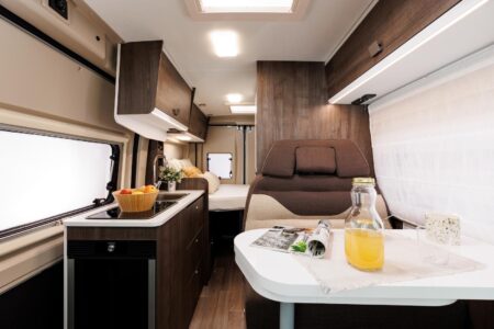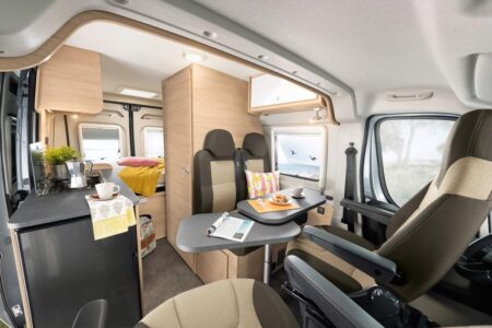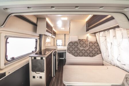 Tous les modèles de cette sélection font appel à un châssis Stellantis (Fiat Ducato, Citroën Jumper, Peugeot Boxer), en version L2 (5,41m) ou L3 (5,99m). Et parce que le lit transversal est le schéma le plus répandu sur ce segment de prix, nous avons retenu uniquement les modèles qui adoptent ce type d’aménagement.
