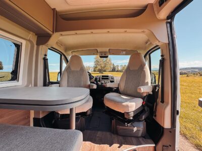 Aussi, si certains équipements renvoyés en option peuvent sembler accessoires (moustiquaire de porte, fenêtre dans la salle d’eau, motorisation 140 ch…), d’autres apparaissent tout bonnement indispensables à nos yeux. On pense ici à la batterie cellule – sans laquelle aucun équipement électrique ne fonctionne à bord -, à l’airbag passager, aux sièges cabine pivotants ou encore … au pommeau de douche.