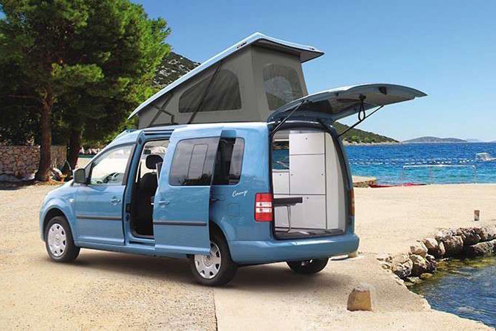 Le constructeur automobile décline son Caddy dans une finition loisirs baptisée Beach. Solution de couchage avant tout, celle-ci comprend notamment un lit repliable (110 x 200 cm), un auvent pour hayon, des sacoches de rangement, des rideaux occultants ainsi qu’un ensemble table + chaises de camping. Existe aussi en version Maxi (4,88 m) ou motorisation diesel, et bientôt sous les lignes plus sportives du Caddy nouvelle génération que Volkswagen vient de dévoiler.