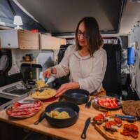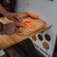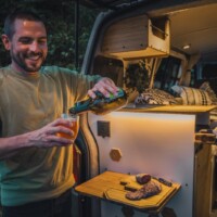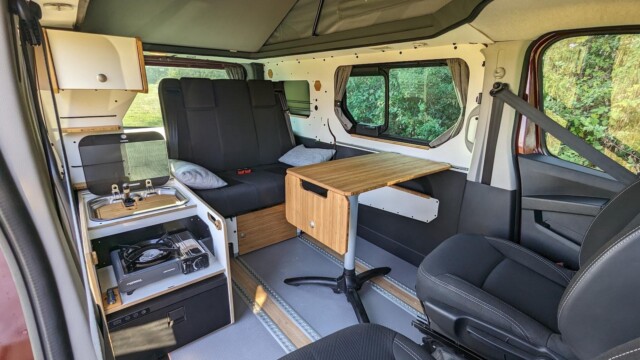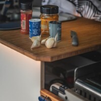 L’aménagement Sud bouscule également les standards de l’agencement intérieur, en retenant une cuisine en long non pas derrière le siège conducteur (façon VW California), mais du côté de la porte latérale. Là encore, cette disposition permet de cuisiner de l’intérieur comme de l’extérieur du véhicule. Et de profiter à fond de la vie en plein-air et de l’environnement avoisinant. Jamais avare de bonnes idées, Van Mania prévoit un plan de travail double fonction, qui servira aussi de plateau de table (immense, au demeurant et articulé en deux parties).