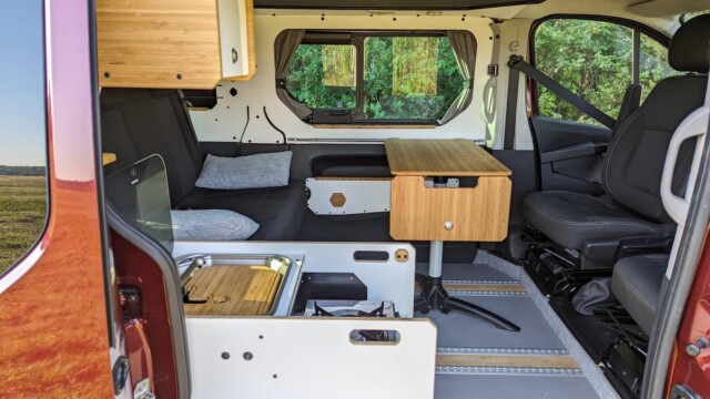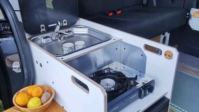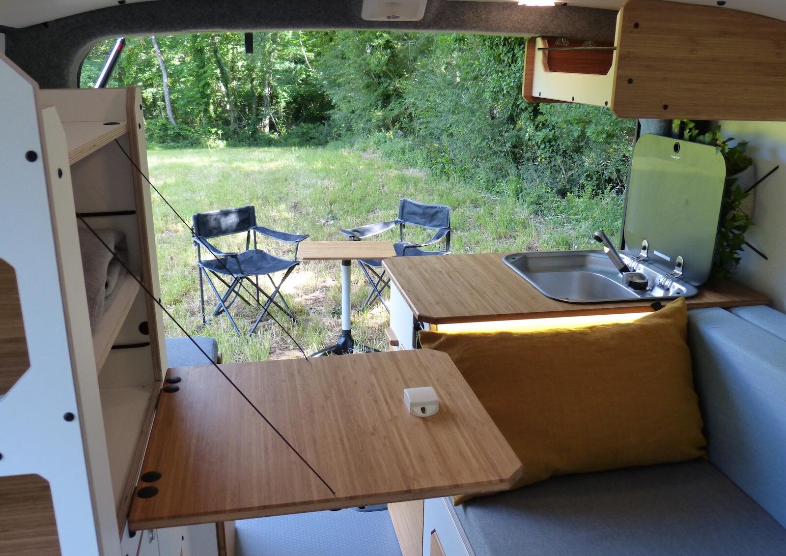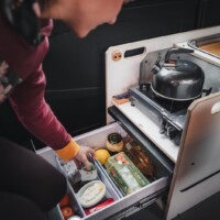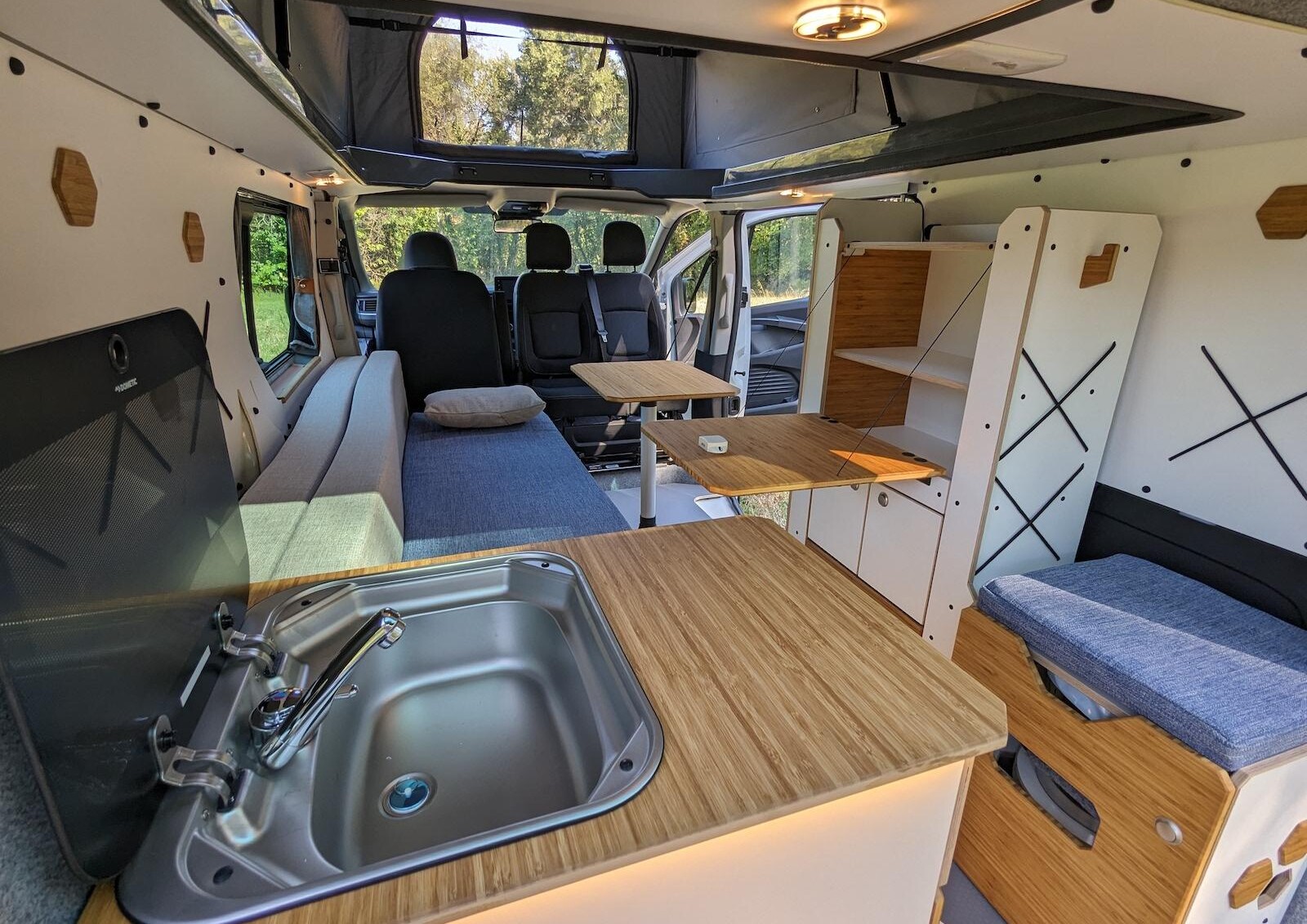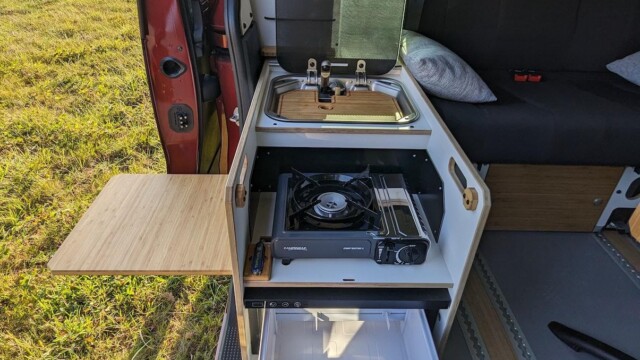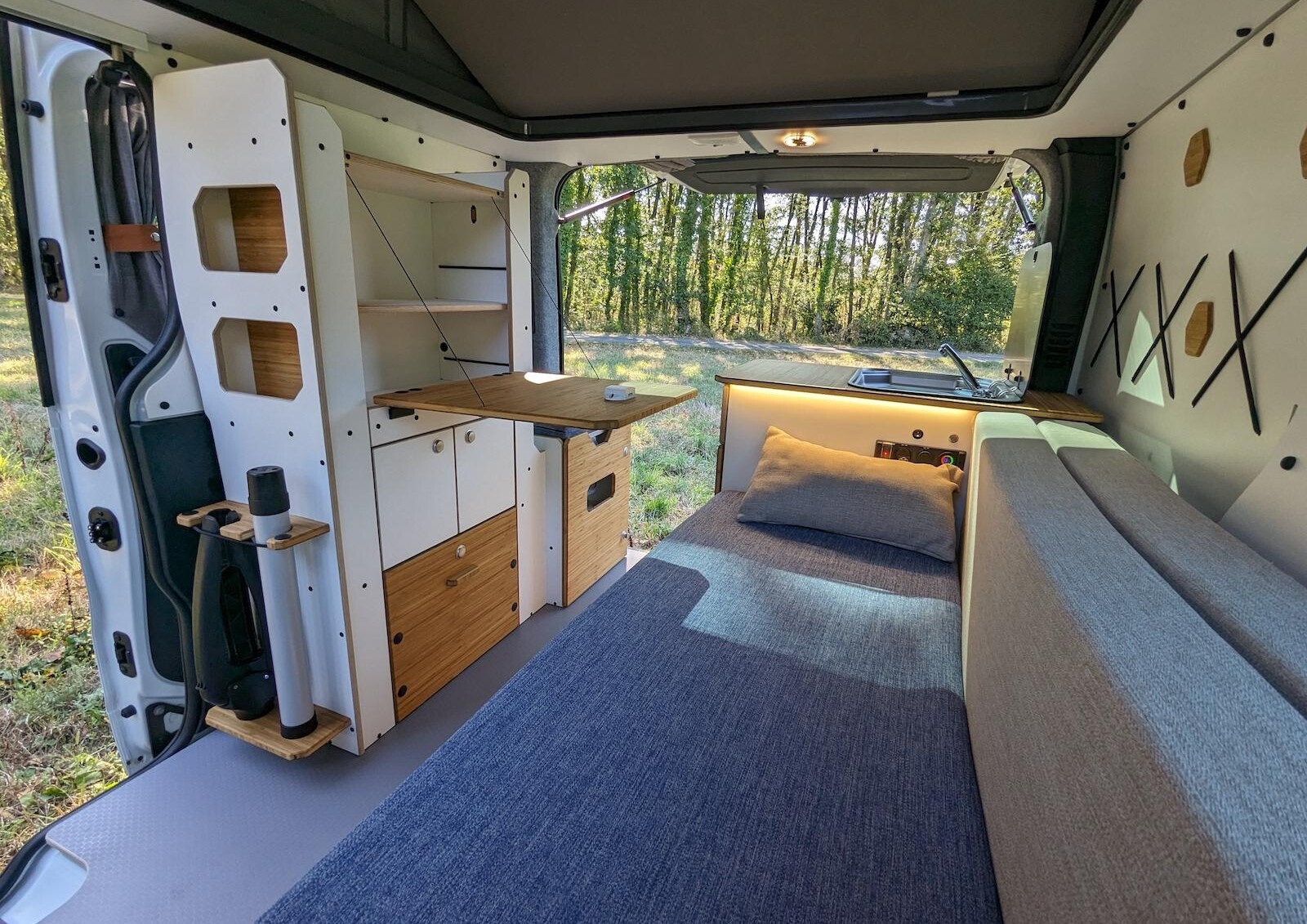 L’autre vraie force de ce kit Nord, c’est sa cuisine disposée à l’arrière du véhicule, dans la largeur. Elle est de ce fait accessible de l’intérieur comme de l’extérieur. Ce qui s’avère très pratique pour ceux qui envisagent avant tout la vanlife en plein-air. Ce meuble cuisine est équipé d’un évier inox relié à une pompe à eau et aux bidons d’eau (12L d’eaux usées / 2 x 12 L d’eau propre), d’un réchaud autonome portatif et d’un tiroir de rangement. Une table, utilisable dehors comme dedans, est également encastrée dans le bloc. Face à la banquette, on retrouve un grand meuble de rangement ; meuble qui incorpore une tablette rabattable qui pourra servir de table secondaire ou de bureau. Celui-ci est prolongé par un coffre pouvant accueillir au choix, un WC portable ou une poubelle. Sous la banquette enfin, viennent se loger un placard et un tiroir ainsi qu’un emplacement au centre pour le frigo coulissant (option).