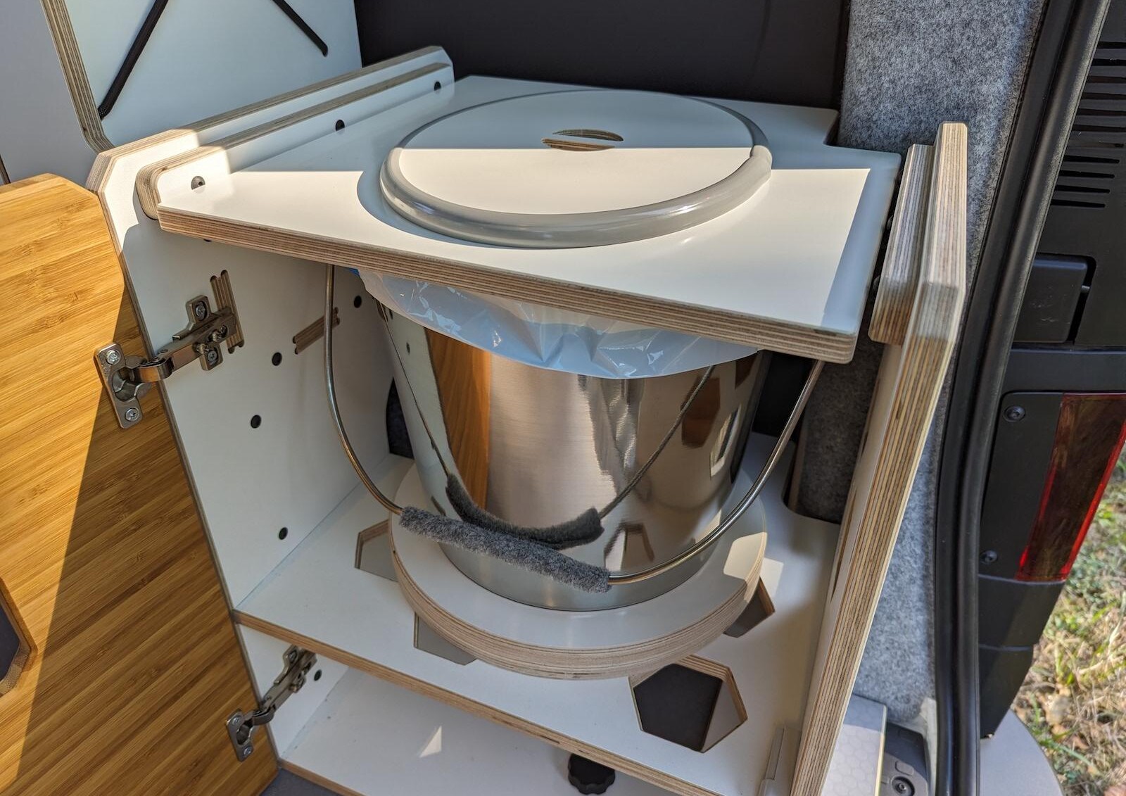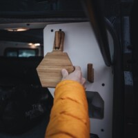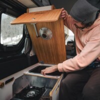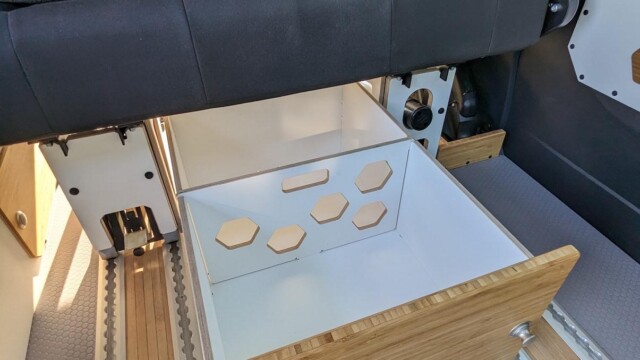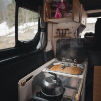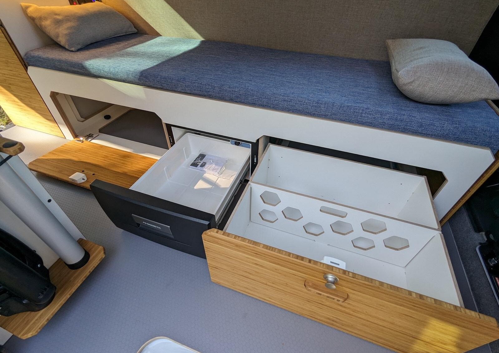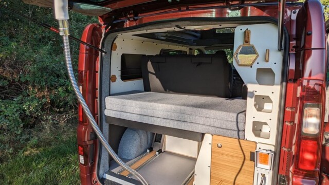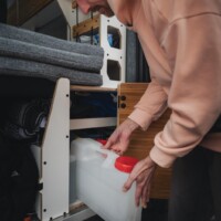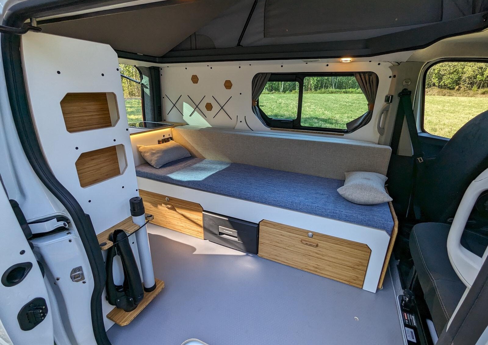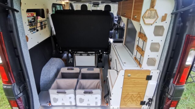 L’autre vraie force de ce kit Nord, c’est sa cuisine disposée à l’arrière du véhicule, dans la largeur. Elle est de ce fait accessible de l’intérieur comme de l’extérieur. Ce qui s’avère très pratique pour ceux qui envisagent avant tout la vanlife en plein-air. Ce meuble cuisine est équipé d’un évier inox relié à une pompe à eau et aux bidons d’eau (12L d’eaux usées / 2 x 12 L d’eau propre), d’un réchaud autonome portatif et d’un tiroir de rangement. Une table, utilisable dehors comme dedans, est également encastrée dans le bloc. Face à la banquette, on retrouve un grand meuble de rangement ; meuble qui incorpore une tablette rabattable qui pourra servir de table secondaire ou de bureau. Celui-ci est prolongé par un coffre pouvant accueillir au choix, un WC portable ou une poubelle. Sous la banquette enfin, viennent se loger un placard et un tiroir ainsi qu’un emplacement au centre pour le frigo coulissant (option).