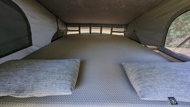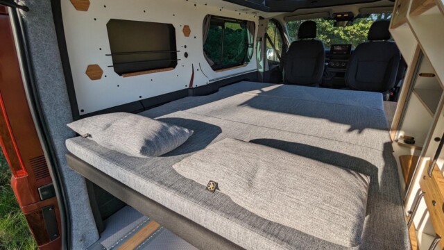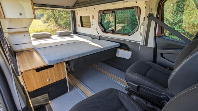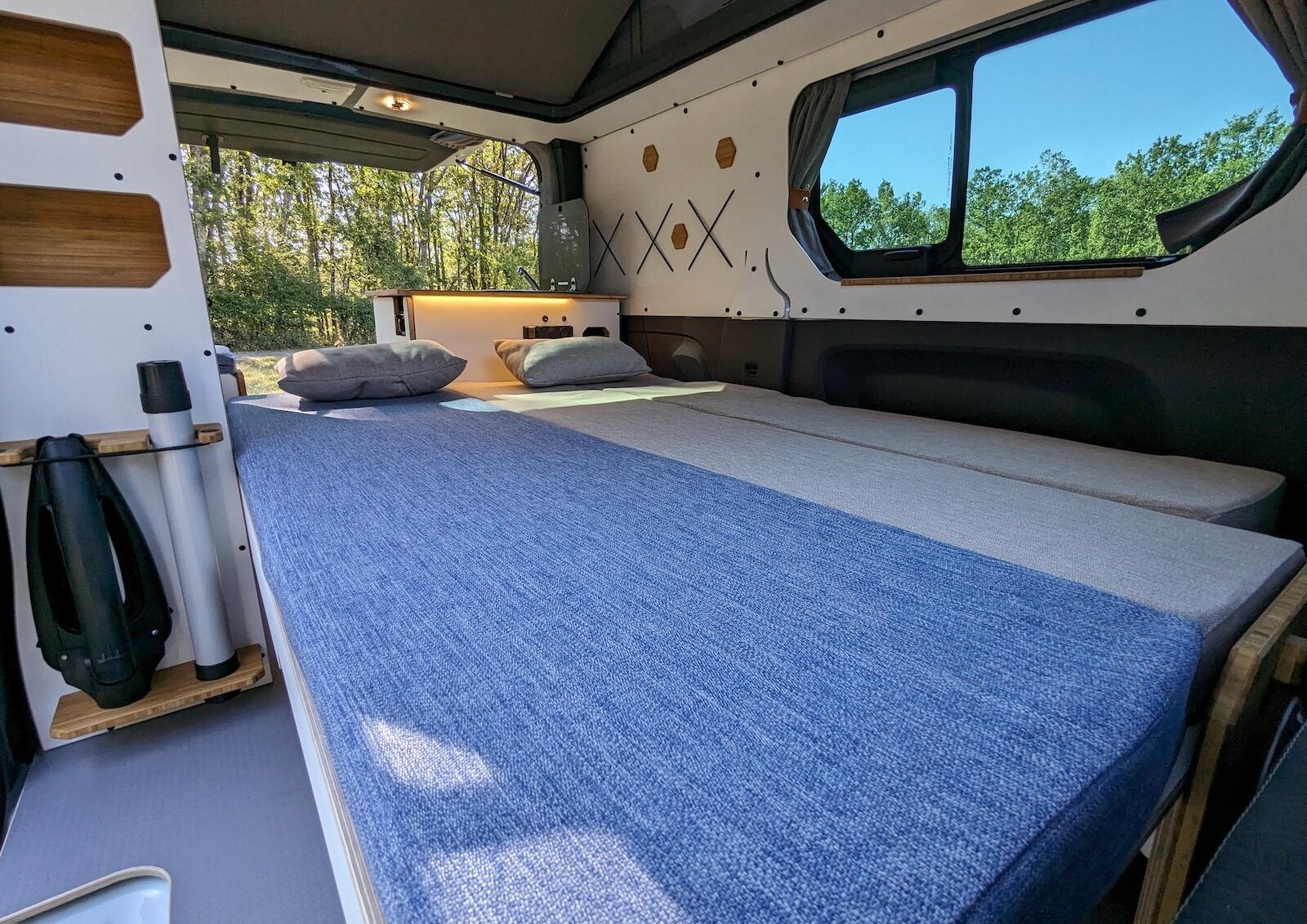 Dans la version VASP présentée ici, le kit Sud dispose d’une banquette arrière coulissante et homologuée pour la route (contrairement à la version démontable, où la banquette arrière est fixe et non homologuée). Selon que l’on retienne 2 ou 3 places en cabine, le van autorise donc de voyager à 4 ou 5 personnes. La nuit venue, cette banquette Schnierle se transforme facilement en un couchage de 187 x 128 cm (surmatelas fourni).