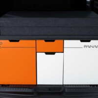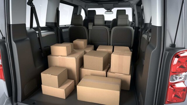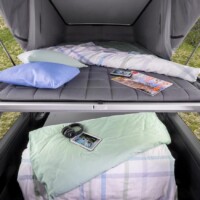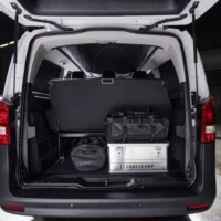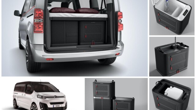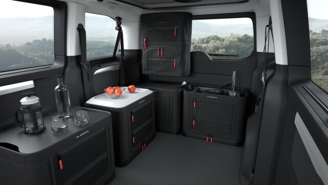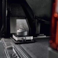 En option (+ 2849€), le kit Camper donne accès à une malle de voyage qui vient s’arrimer à l’arrière du véhicule. Celle-ci inclut un évier en inox, des réserves d’eau propre (16L) avec pompe immergée et d’eaux usées (19L), une plaque de cuisson à induction additionnelle (l’autre étant alors condamnée), un réfrigérateur portable à compression (24L), une douchette extérieure, des rangements et un matelas à déplier sur la banquette rabattue. L’aménagement peut être complété par d’autres packs, dont un comprenant des équipements électriques (panneau solaire 100W, batterie 70 Ah, chargeur de batterie 230 V, booster DC/DC).