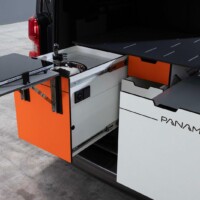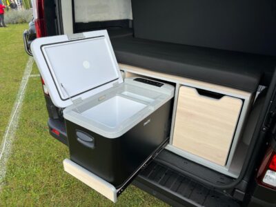 La grande nouveauté réside ici dans la possibilité de choisir l’emplacement de la cuisine. Celle-ci peut prendre place dans un meuble au dos du siège conducteur (qui, du coup, ne pivote pas) ou à l’arrière, intégrée à une malle de camping. La première variante comprend un évier avec robinet et pompe immergée, deux jerrycans de 10 L, un frigo à compression de 50 L, un réchaud à cartouche gaz ainsi qu’un placard. Alors que la seconde – moins complète – inclut une bassine rétractable, un jerrycan de 10 L, un réchaud à cartouche gaz, une glacière à compression de 25L et des placards et tiroir.