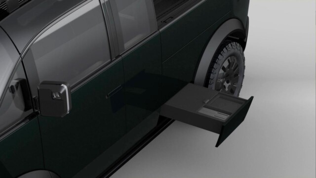 Très polyvalent, ce véhicule dispose d’une benne de 1,63m de large sur 1,82m de long. Une innovante plateforme, à déploiement électrique, permettra d’allonger la benne jusqu’à 2,60m. D’autres solutions ingénieuses sont par ailleurs développées : ridelles latérales basculantes pouvant servir de tablette, marches rétractables intégrant des rangements, large coffre de stockage niché derrière la calandre, plancher modulaire, etc. Le véhicule incorporera également des pneus tout-terrain et une galerie de toit avec fixations ajustables.