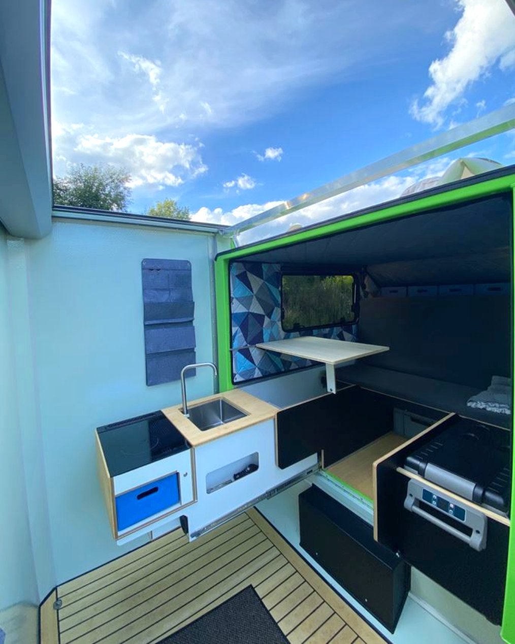 Le deuxième caisson intérieur contient tout l’équipement camping-car : un canapé-lit, et les meubles cuisine de part et d’autre d’un petit couloir central. Le canapé se transforme en couchage 200 x 147 cm, en le dépliant sur l’ensemble des équipements qui deviennent inaccessibles la nuit. Replié, le canapé délimite un petit salon avec table amovible et rangements derrière le dossier. Un côté du caisson héberge le réfrigérateur à compression de 45L , tandis que l’autre accueille la table de cuisson et l’évier, entièrement coulissants vers l’entrée, afin de cuisiner debout.