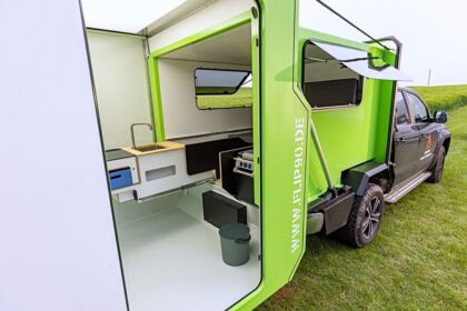 Les aménageurs redoublent d’imagination pour agrandir l’espace de vie à l’étape. Dernière invention en date, une extension rotative à 90° « Flip » adossée à un pick-up, activée électriquement elle ajoute une précieuse hauteur debout à la cellule de base. Le Pick-Up Flip90 embarque pièce de vie avec canapé-lit, dînette, cuisine, toilette, douche et entrée.