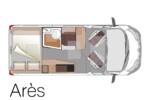 - Arès (5,41m) – Modèle 4 places route avec dînette avant et lit transversal arrière