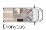 - Dionysus (5,41m) – Strict 2 places route avec salon arrière convertible en lit transversal. Une grande armoire occupe l’espace libéré par la banquette face-route.