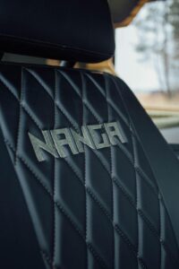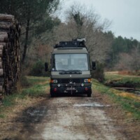 En lieu et place de ses 6 petites roues (dont 4 jumelées à l’arrière) d’origine, Van Helping lui greffe 4 roues de Mercedes Vario, avec pneus off-road 18,5’’. Une transformation qui confère au véhicule une meilleure adhérence et une garde au sol plus élevée, mais qui oblige toutefois à changer le jeu de roues au moment des contrôles techniques. « Le Nanga n’est pas un véhicule tout-terrain, mais il permet tout de même de s’aventurer sur les chemins », précise l’artisan-aménageur.