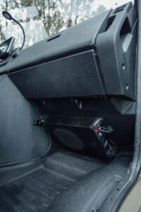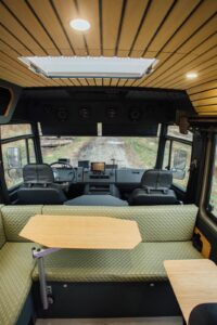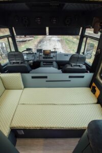 Plus globalement, le véhicule d’origine a été entièrement restauré. « Nous avons sablé les parties de carrosserie qui étaient abimées, ressoudé quelques éléments du châssis, remplacé certaines pièces d’origine, détaille le jeune aménageur de 36 ans, qui travaille dans le camping-car depuis ses 18 ans. La carrosserie a aussi été recouverte d’une peinture mat anti-rayures Raptor vert kaki / noir. Même l’intérieur de la cabine a été repeinte car les plastiques avaient mal vieilli ».