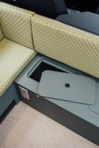 Au salon, la banquette – transformable en lit – a été confectionné sur-mesure par un sous-traitant. Elle a recours à un capitonnage et un tissu haut de gamme. La quincaillerie, de son côté, est de type marine. Pour le reste, voici un aperçu des principaux équipements de bord :