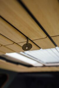 Et puis il y a l’aménagement en tant que tel. Au résultat spectaculaire. « Ce qui nous prend une heure de travail sur un camion lambda nous en a pris quatre ici », glisse Florentin. Dessiné par Guillaume, le mobilier est conçu en contreplaqué ultra léger de peuplier, recouvert de stratifié haut de gamme Fenix. L’habillage façon pont de bateau des parois et du plafond est réalisé à partir de contreplaqué peuplier teinté en noir et de lames de bois exotiques usinées à la main. Soin est pris ici d’habiller même le cadre des baies et lanterneaux pour cacher les moustiquaires et stores. On retrouve aussi du bambou brut à plusieurs endroits : table, caillebotis, habillage haut de la paroi de douche, flancs de placards de pavillon, claustra ou moucharabier (c’est-à-dire la paroi ajourée séparant la cuisine du lit)…
