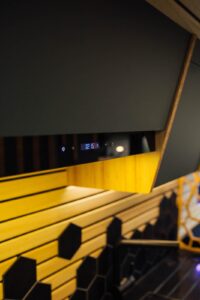 Dans ce travail du bois, certains détails soulignent le savoir-faire exceptionnel de l’équipe de Van-Helping, et notamment de Guillaume, qui s’est occupé de fabriquer les arrondis sous presse. « Le compartiment de la salle d’eau cintré sur près de 2 mètres de haut, les alcôves et encadrement de fenêtres aux formes design avec leurs chants en chêne ou encore le moucharabier ont pris un temps monstre, appuie Florentin. Rien que sur la cloison de la salle d’eau, nous avons cassé deux plaques de stratifié à près de 300€ HT ». En cuisine, le plan de travail, l’égouttoir et les carreaux au mur sont fabriqués en Corian, façonné à la main, poli, lustré…. Comme les contours du bac de douche. Un travail d’orfèvre.
