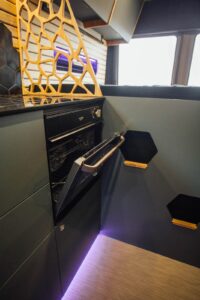 - Cuisine – Plaques de cuisson vitrocéramiques Webasto Diesel Cooker (1800 W) fonctionnant au gasoil, four Thetford Duplex (1600 W), frigo à compression 85 L, hotte Dometic CK 500, 2 poubelles