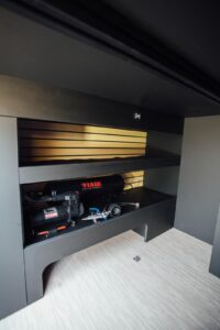 Pour le choix des équipements, c’est le grand luxe à tous les postes. La cabine tout d’abord s’équipe de trois écrans : un autoradio Pioneer (associé à un kit son Focal), un GPS Garmin off-road et un retour de caméra Dometic. Cet écran, placé à gauche et relié à 4 caméras extérieures, donne une vision à 360° autour du camion. « Selon que l’on effectue une marche arrière ou un dépassement par exemple, l’écran diffuse automatiquement une vue arrière ou latérale », explique Florentin.