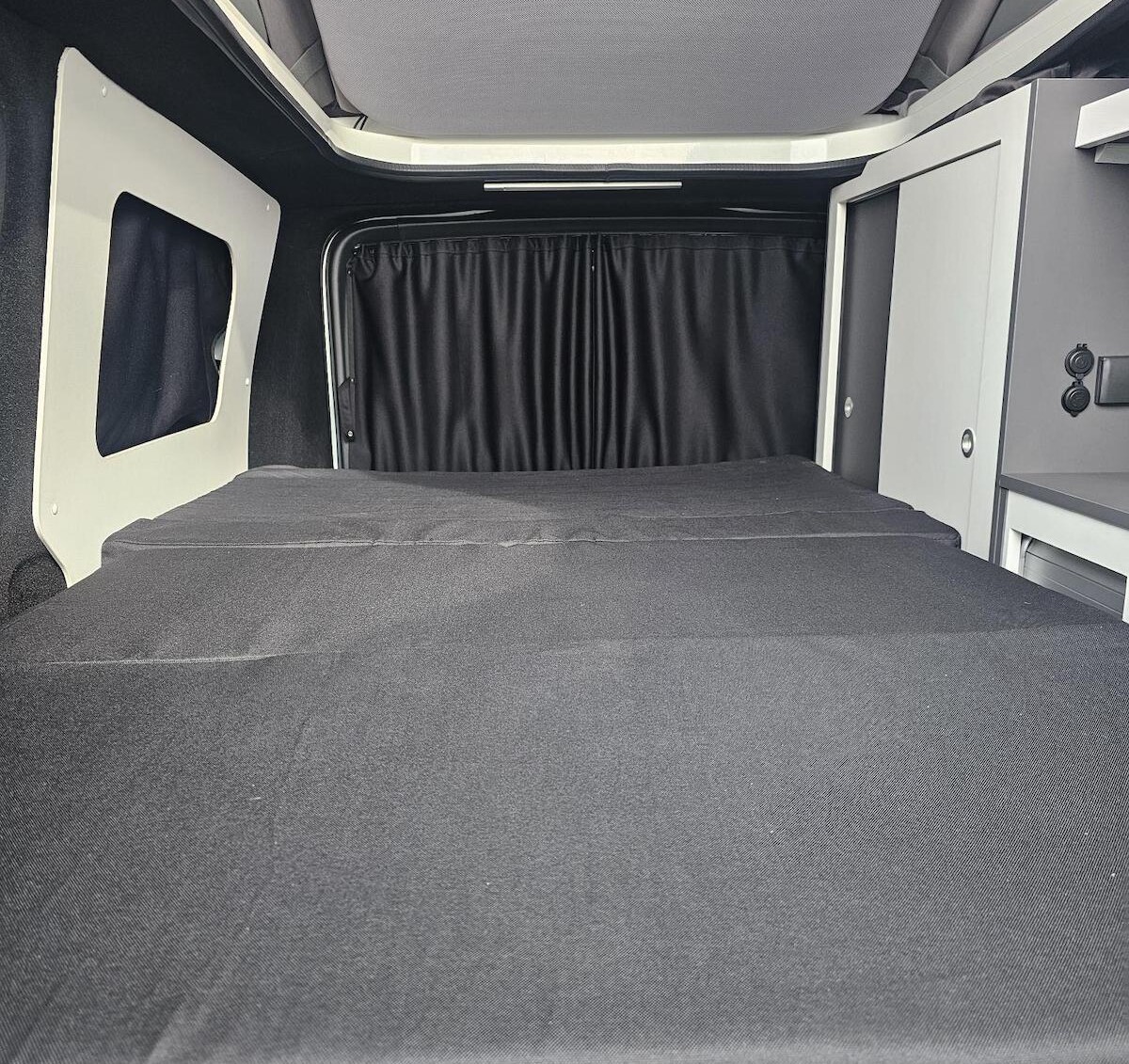 A bord de ce Renault Trafic (5,48 m), vous dormez dans le sens de la longueur (1,96 x 1,90 m), en exploitant toute la surface du matelas, ou seulement les deux parties latérales, comme sur des lits jumeaux, en gardant un accès au centre.