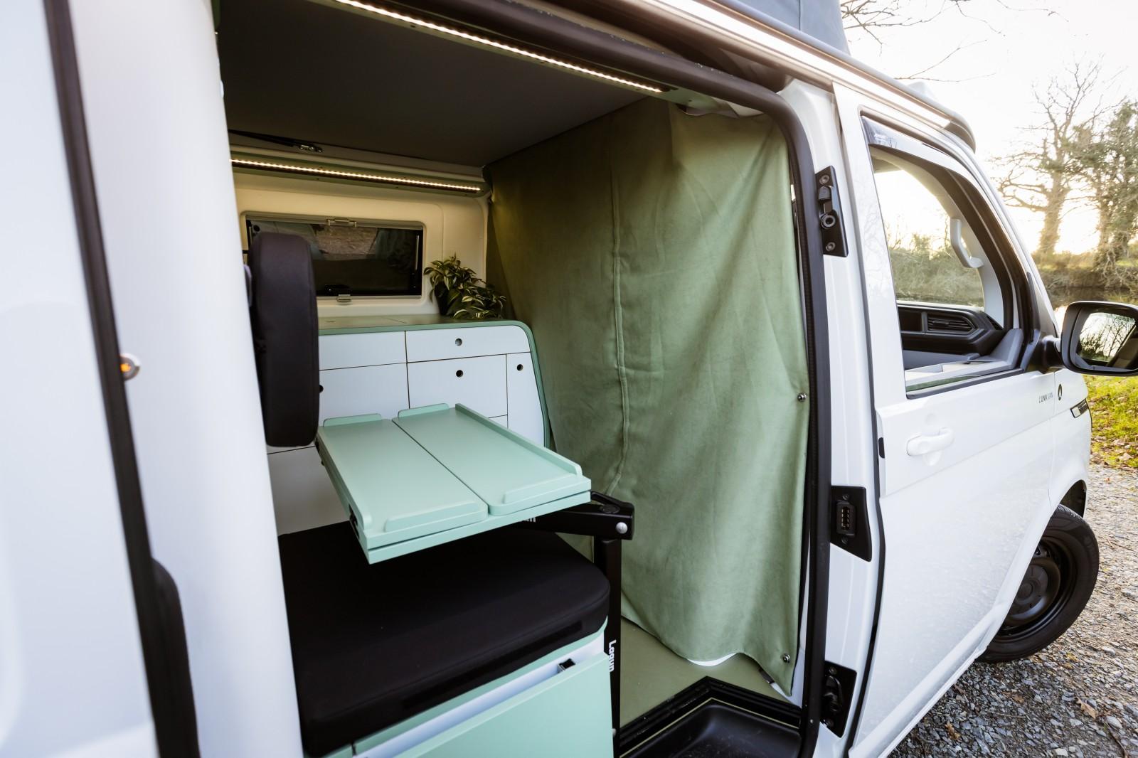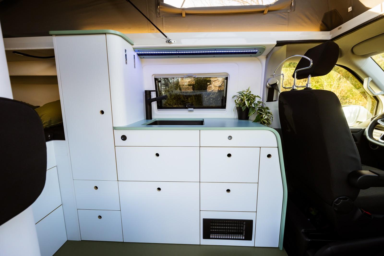 Pour un confort maximal, le van est équipé de la Thermobox Evo de Webasto, qui fournit le chauffage et l’eau chaude en moins de cinq minutes. La douchette extérieure, qui se forme à l’aide d’un rideau intégré au hayon, permet ainsi de se laver à l’eau chaude. Pas si courant dans un van !