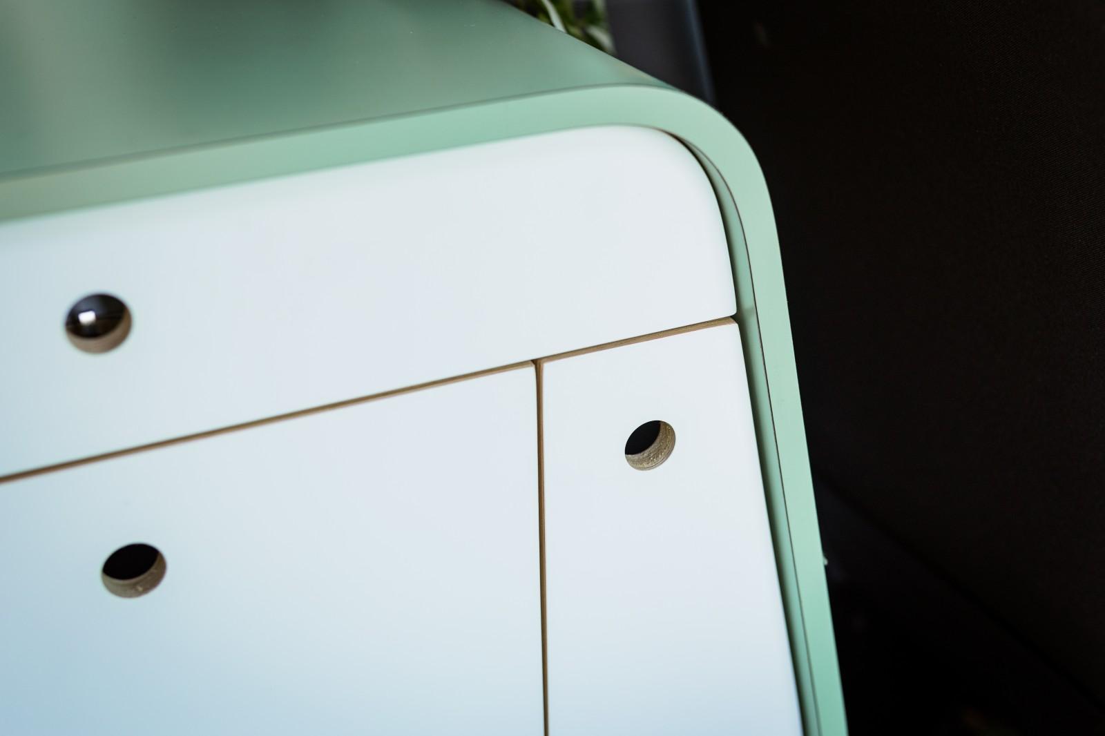 Face à l’entrée, le bloc cuisine dévoile un design moderne. Le plan de travail et le flanc droit du meuble – au coloris vert menthe – sont réunis par une courbe et forment ainsi une seule et même pièce. Élégant. Cette cuisine incorpore un ensemble évier/robinet ainsi qu’une plaque de cuisson à induction (2000 W) logée dans un tiroir. De la sorte, un plan de travail reste disponible en permanence.