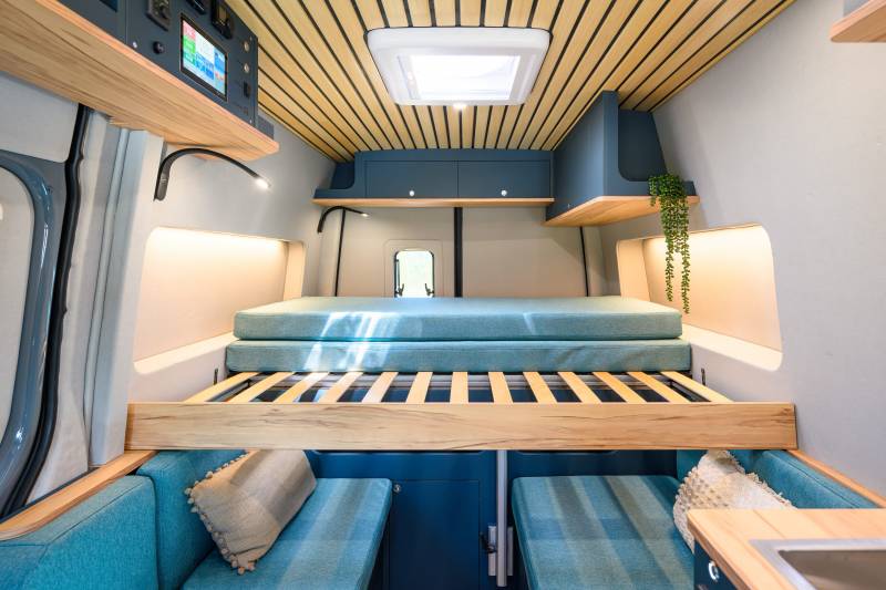 Fruit de 5 ans d’expérience dans les aménagements sur-mesure, le Pyla est le premier modèle produit en (petite) série par le talentueux atelier girondin Van Designers. Sur Fiat Ducato ou Peugeot Boxer L3H2, il offre des prestations haut de gamme : isolation en liège projeté / laine BioFib Trio, habillage de paroi en textile haut de gamme Silvertex et contreplaqué Queenply, plan de travail en Corian, revêtement de sol en Bolon, quincaillerie Blum, batterie lithium 200 Ah, panneaux solaires 500 W, convertisseur, chauffage et chauffe-eau instantané au gaz, réserve d’eau propre de 170 L, four à gaz, etc. A partir de 91.990 € en motorisation 140 ch / BVM.