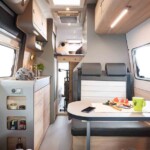 Côté plan, l’Alphavan privilégie à l’arrière une chambre en mezzanine ; installée en surplomb d’un grand garage à vélos/moto. Comme son nom l’indique (« Flexport »), ce garage offre une certaine flexibilité puisqu’on peut y ajouter un couchage dépliant qui transformera l’espace en chambre d’enfant. L’avant est occupé par le salon 4 places, tandis que le centre du véhicule est réservé à la cuisine latérale et la petite salle de bain tout en un (WC/douche/lavabo en tiroir).
