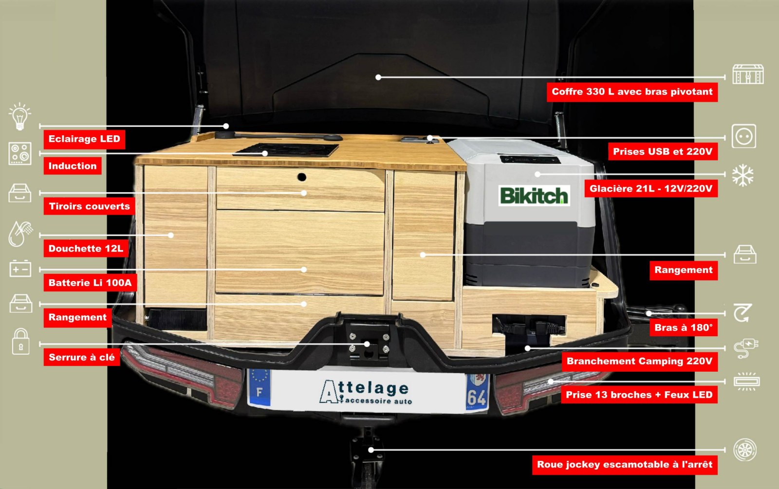 Cette solution transforme un véhicule du quotidien en véhicule de loisirs, ou vient compléter un aménagement existant. La box Bikitch est composé d’un coffre de 330 L fixé sur attelage, qui contient un meuble amovible. Dédié à la cuisine ce dernier est équipé d’une glacière à compression de 21L, d’une réserve d’eau propre de 12L, d’une batterie lithium 12V/220V et d’une plaque à induction.