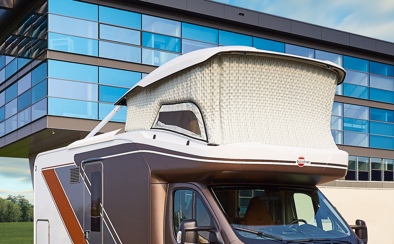 Fabricant généraliste de camping-cars, fourgons et vans, Bürstner nous dévoile un prototype de véhicule de loisirs totalement novateur. Le Lyseo Gallery – c’est le nom du show car présenté en Allemagne, près de Kelh – associe l’aérodynamisme d’un profilé et le volume à vivre imbattable d’une capucine. L’astuce : si le véhicule de 6,96 m de long garde une silhouette de profilé classique en mode route, un toit relevable de type pneumatique permet de transformer à l’étape sa casquette en gigantesque capucine… Le profilé de 2,96m de haut se transforme ainsi en une capucine culminant à 3,70m et accueillant une chambre, accessible par un escalier. Cette chambre offre une hauteur sous plafond constante d’1,10m et compte de multiples agréments : table, prise USB, aérations et ouvertures, spots LED…