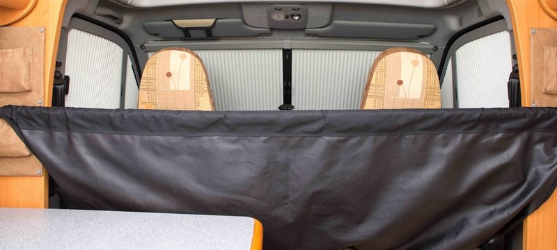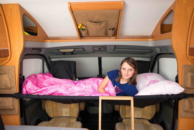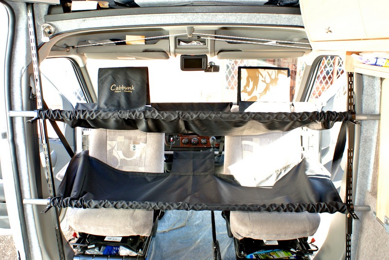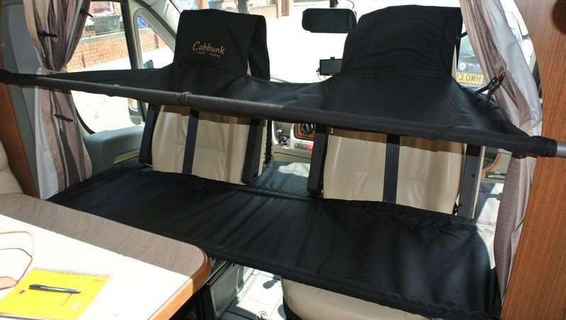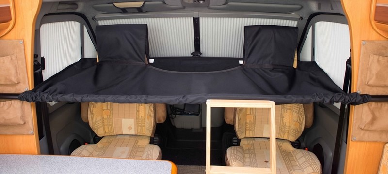 A la façon d’un hamac, sa couchette fait appel à un tissu tendu Cordura, pouvant supporter jusqu’à 70kg de charge. Long de plus d’1,80m, ce lit d’appoint repose sur l’appuie-tête des sièges pivotants d’un côté et sur une solide barre télescopique en aluminium de l’autre côté (elle-même fixée à des crochets sur les parois ou deux montants métalliques amovibles dans le cas des fourgons à portes coulissantes). Point fort du système : il peut aujourd’hui être adapté à la plupart des porteurs de dernières générations, versions fourgons ou camping-cars : Renault Master et Trafic, Mercedes Sprinter, Ford Transit, Fiat Ducato, Citroen Jumpy, Peugeot Boxer, VW T5… Aussi, le couple propose depuis 2014 un système de couchettes superposées, avec un lit en contrebas qui prend appui sur les sièges pivotants.