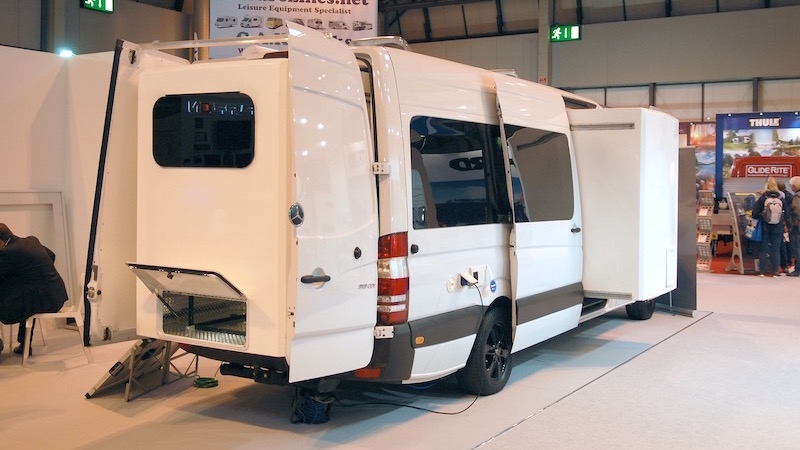 Lippert Au salon de Birmingham, on a pu découvrir un Mercedes Sprinter 313 équipé de deux extensions:  une à l’arrière du véhicule et l’autre sur le côté droit. Cette dernière ne condamne pas la sortie puisqu’elle se fait à gauche. Ce grand tiroir latéral abrite une grande salle de bains avec une cabine de douche confortable.
