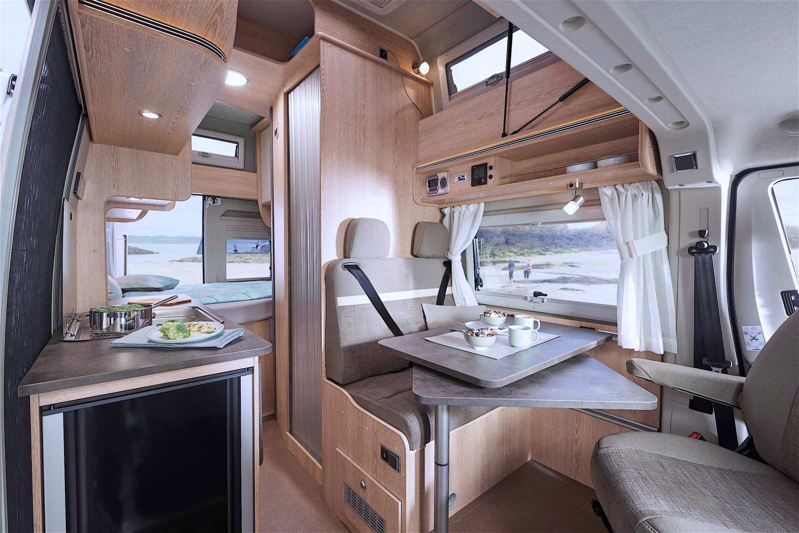 Également dans la gamme SUMMIT, est proposé le Summit 600 Plus (6 m). Cet élégant camper van se distingue par son décor chêne cuivré chaleureux et contemporain, très apprécié des amateurs d’ambiances modernes. De surcroit, son équipement Plus de série offre une montée en gamme à tous les niveaux.