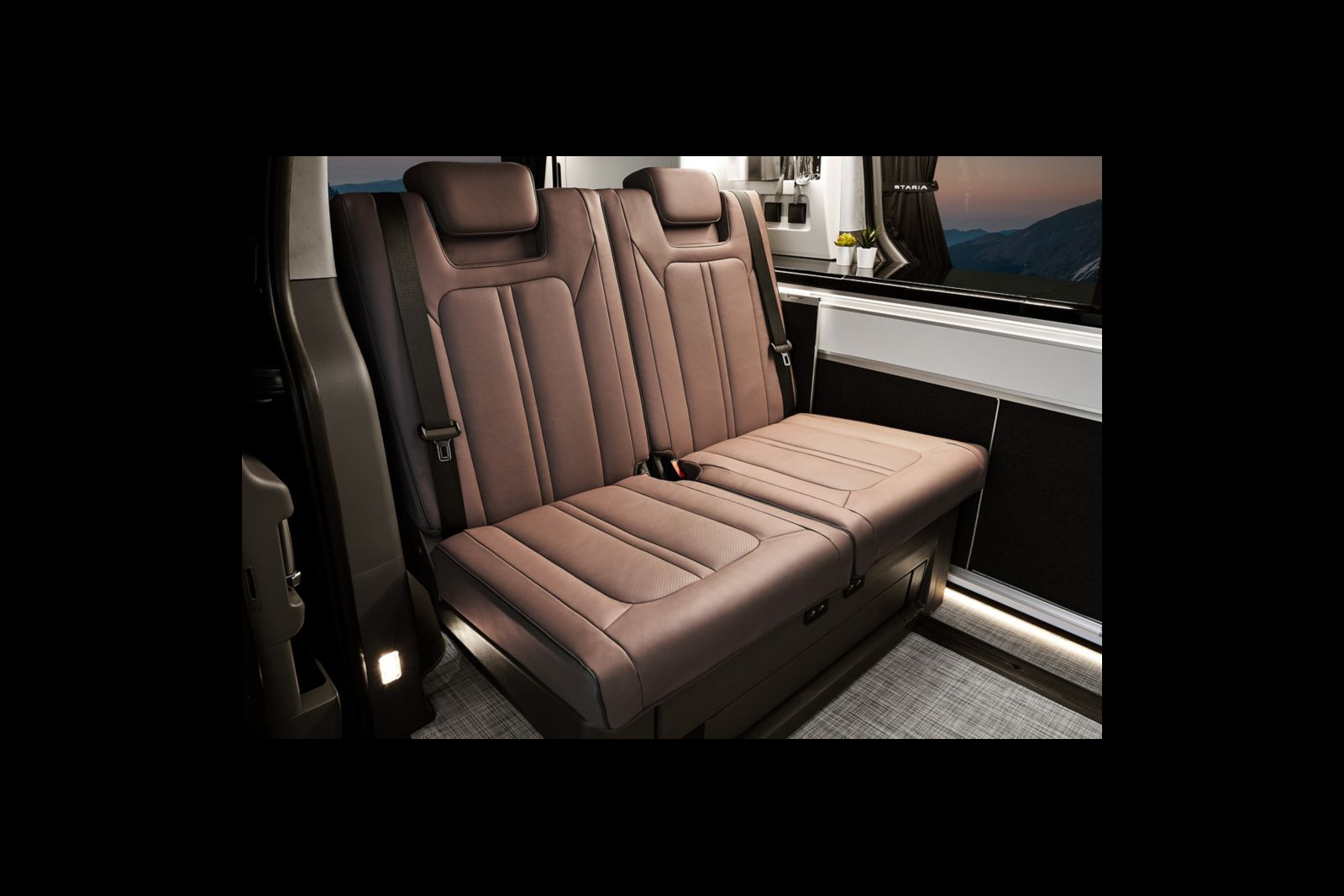 Grand monospace de 5,25 m au design futuriste, le STARIA Camper Concept se distingue par un toit relevable entièrement intégré et motorisé, qui améliore l’habitabilité et la luminosité tout en préservant l’aérodynamisme et le confort acoustique au roulage. Conçu pour répondre aux attentes des voyageurs modernes, il vise un usage polyvalent grâce à une banquette coulissante et convertible. Les deux fauteuils se rabattent à plat en appuyant sur une commande électrique. Comme sur le Mercedes Marco Polo.